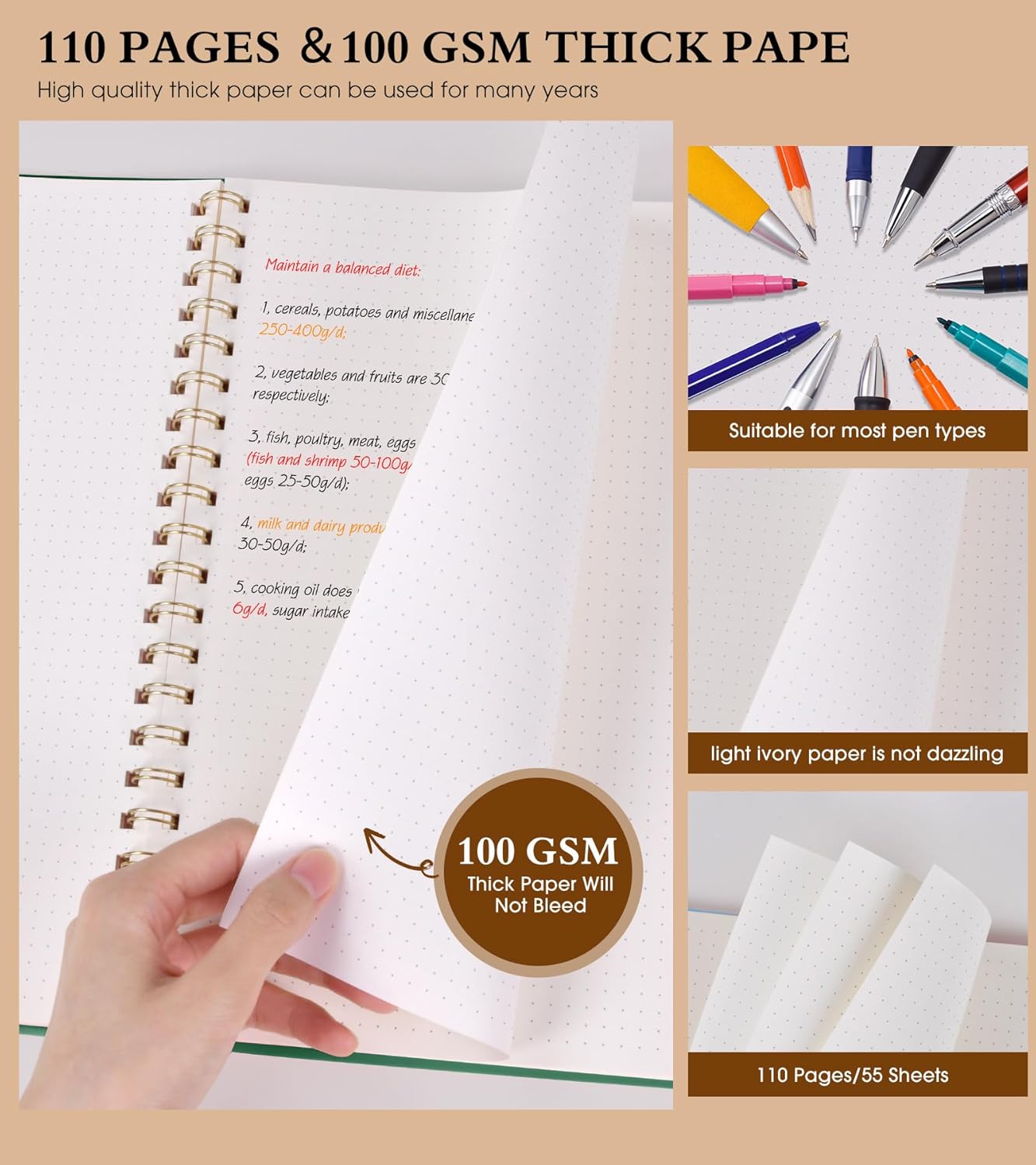 - 【100 GSM Ink-friendly Paper】 Our green spiral dot grid notebook pages are very thick, which avoids ink bleeding through and ghosting. Suitable for most pen types, such as ballpoint pens, fountain pens. Each dotted journal 55 sheets/110 pages, offering enough space to write in. Allowing you to write on both sides of every page to maximize your usable space. light ivory paper is not dazzling, let you have a comfortable writing experience.