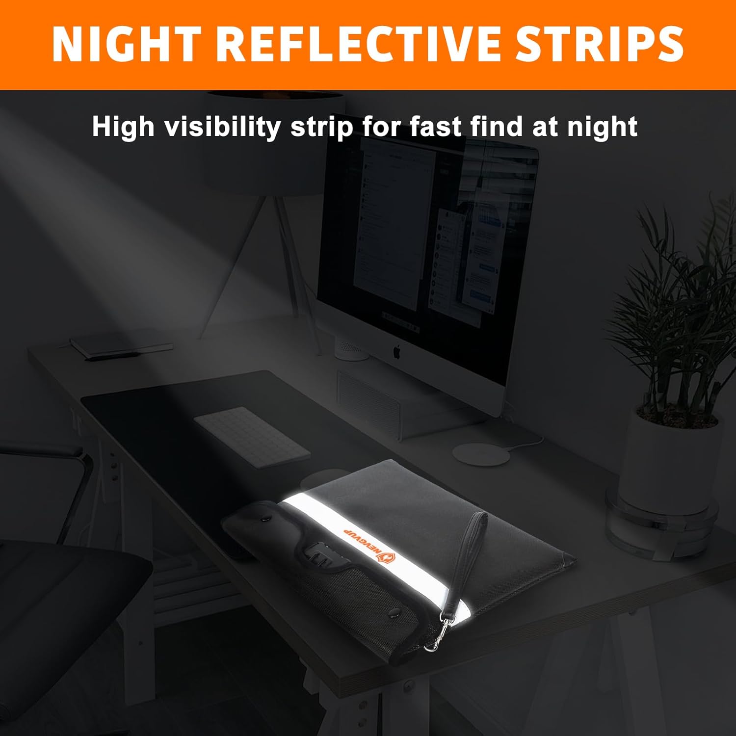 - 6200°F TOP FIRE PROTECTION: Upgraded fireproof bag with lock has passed Global Flammability Standards (US labs) and Vertical Combustion Testing (SGS UL94 V-1); Recommended by professional firefighters and tested in the most demanding environments; The Upgraded fire proof money bag for cash can withstand ultra high temperatures up to 6200°F; It is worth mentioning that the reflective strip of Hand-carry fireproof bag has high visibility at night, which is easy to quickly find in a fire
