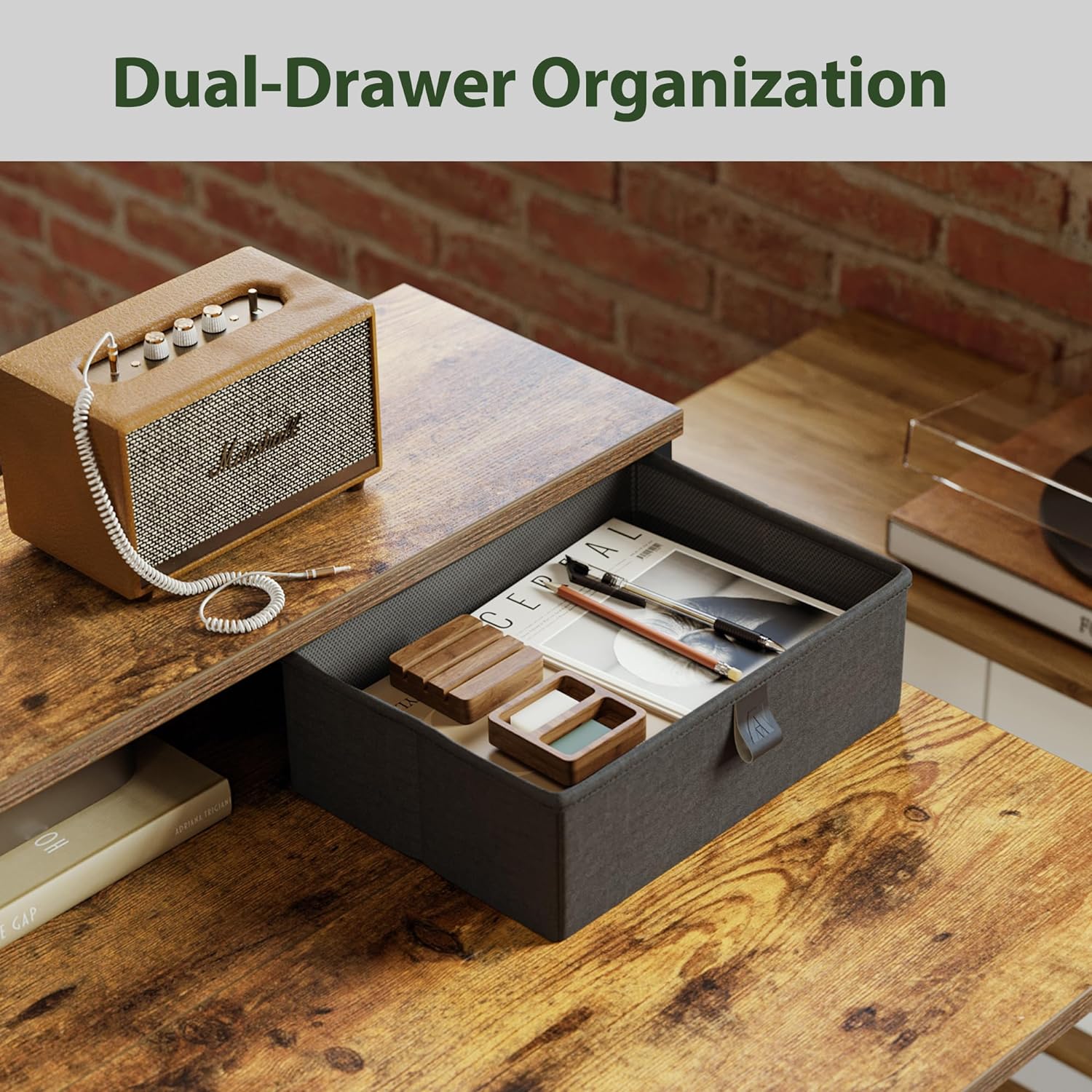 - 【2 Fabric Drawers】The 2 fabric drawers above the desktop can organize your clutter and keep the desktop clean and tidy at all times. The tabletop is made from low-VOC materials and meets federal and state safe air standards.