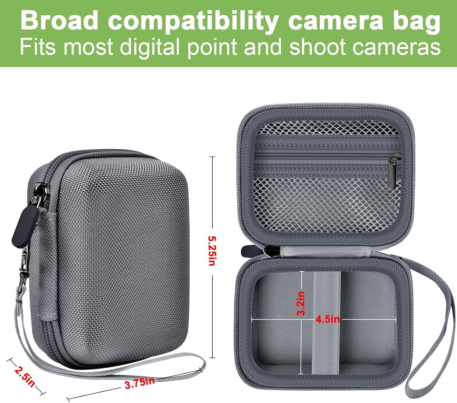 - Secure elastic strap- Equipped with a reliable elastic strap, securely fasten your cameras for photography. The interior accommodates point and shoot digital cameras sizes up to 4.5*3.2*1inches, suitable for most mini camera models. The external box size: 5.25*3.75*2.5inches.