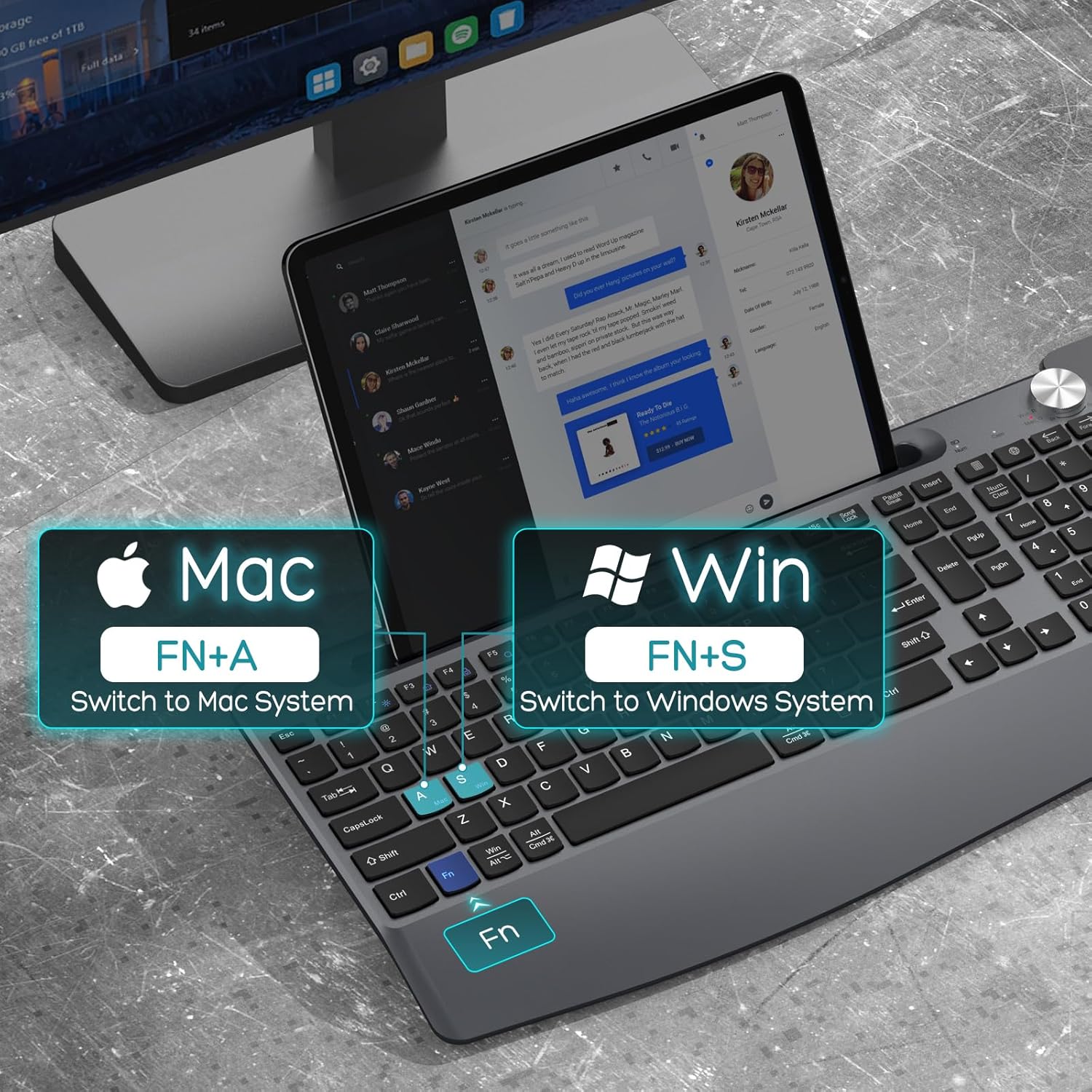 - 【Full-Size Keyboard With Phone Holder】The full-size wireless keyboard is designed with a phone and tablet holder. Provides you with additional space to place your phone, tablet, or other gadgets,never miss anything important messages again.You can work by using a laptop when placing a phone or tablet, or watching videos while working.(Note: Keyboard only hold the devices,not work with them.)