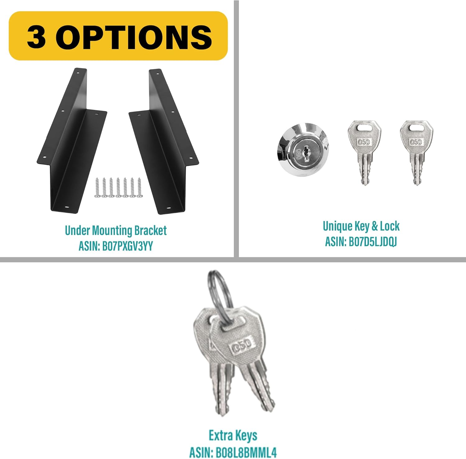 - 🔑 Additional Accessories: Extra keys (ASIN: B08L8BMML4), Unique Key and Lock (ASIN: B07D5LJDQJ) and Under Counter Mounting Metal Bracket (ASIN: B07PXGV3YY) are available, if needed.
