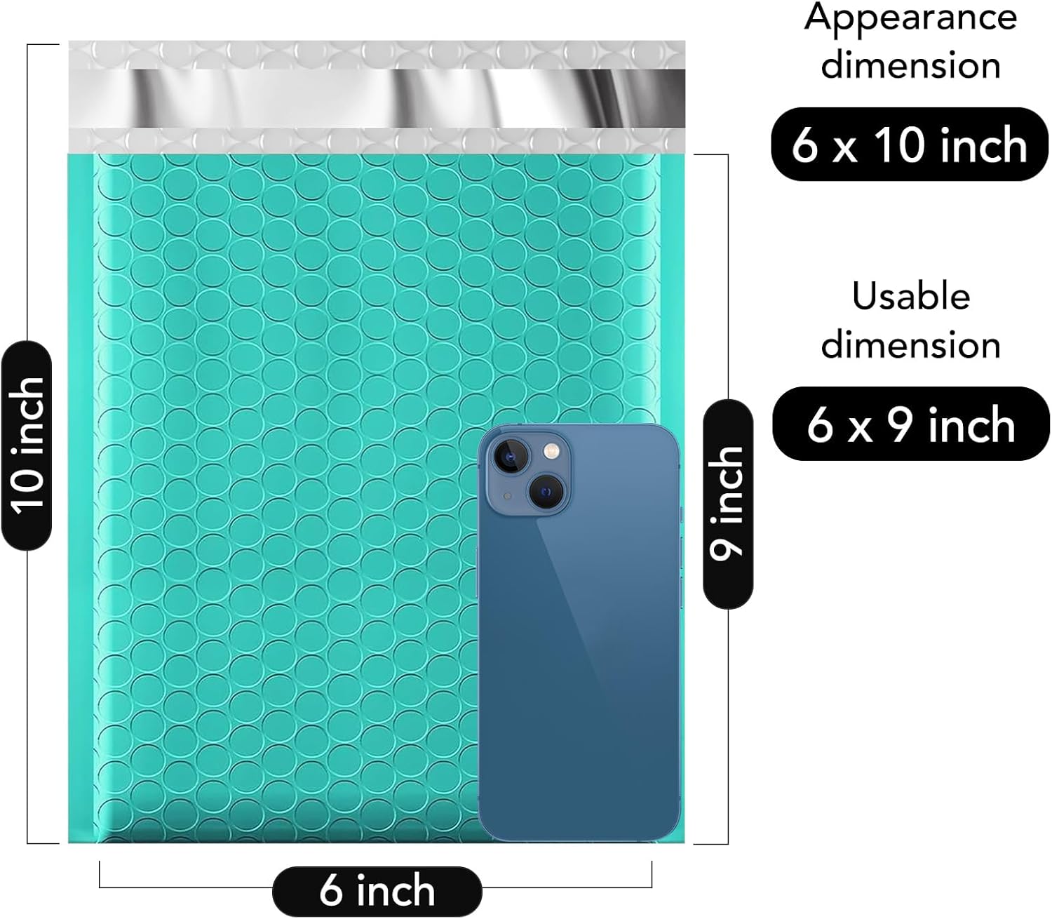 - Perfect Size Teal Bubble Mailer: The poly bubble mailers outer size is 6x10 inch, while the inner size is 6x9 inch. It is very suitable to transport for jewelry, makeup, cards, phone case, Lips, photos, handcraft and more.