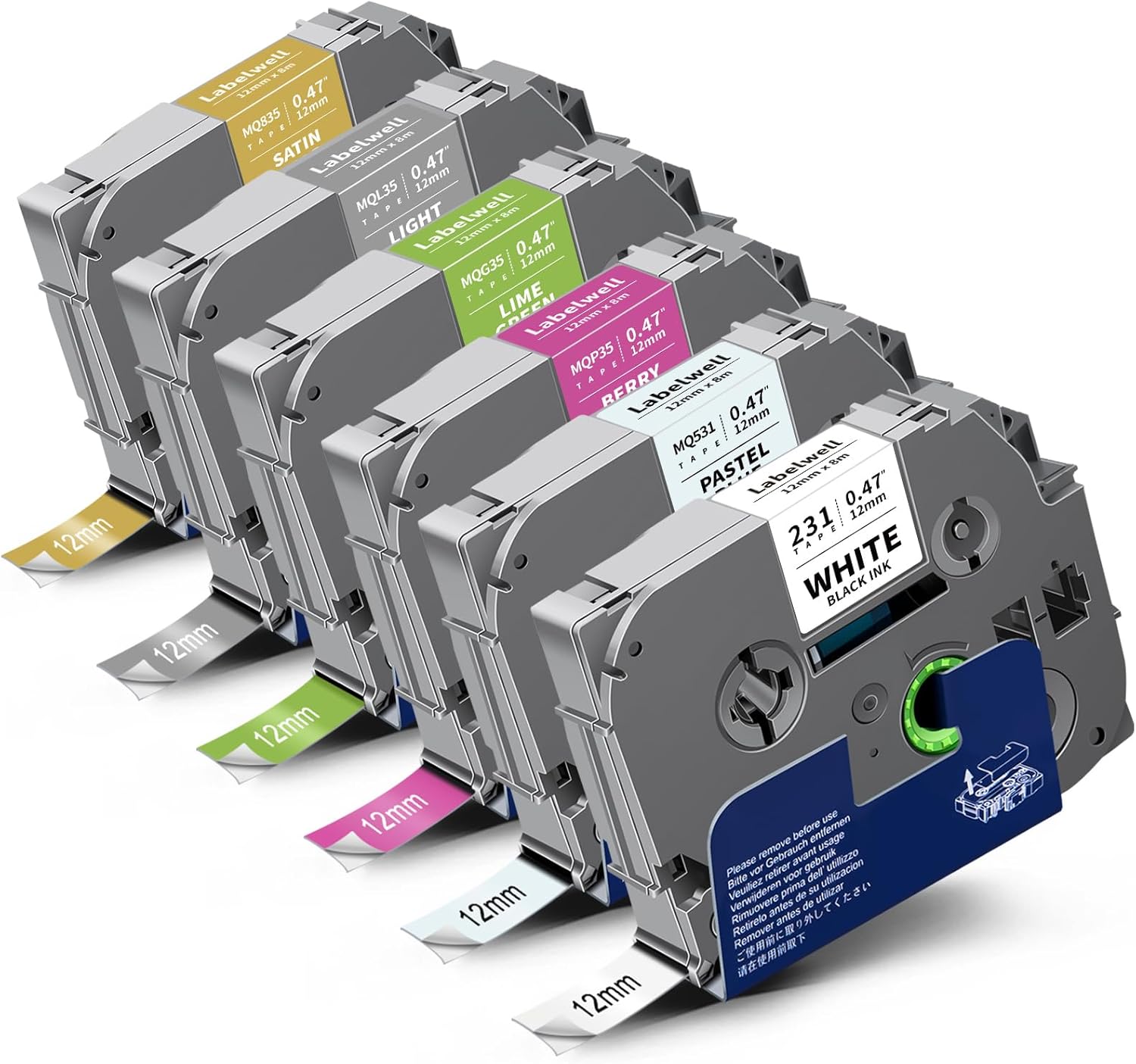 - Package Contents: 6-Pack Replacement for Brother P Touch Label Tape TZe-231 (Black on White), TZe-MQ531 (Black on Pastel Blue), TZe-MQP35 (White on Pink), TZe-MQG35 (White on Lime Green), TZe-MQL35 (White on Sliver), TZe-MQ835 (White on Gold), total 6 packs