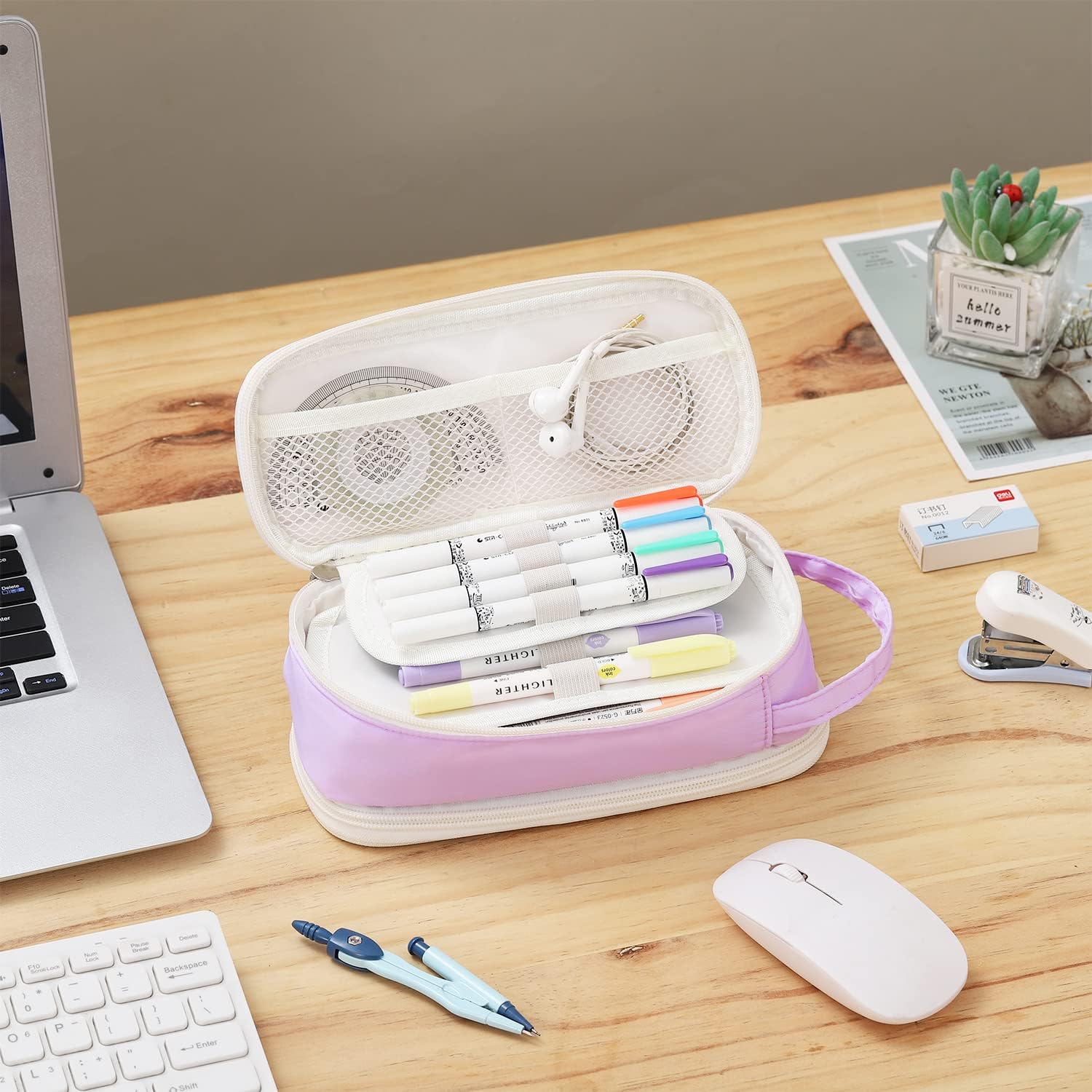 - Product Features: This pencil case has 2 mesh pockets, 2 pencil slot panels, a large storage layer, 2 velcro pockets, and a big pocket inside. the bigger clapboard is removable.