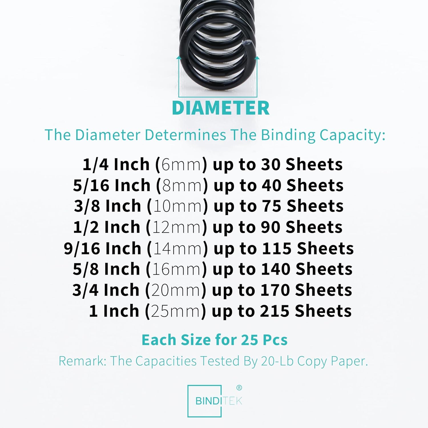 - 【Multi Size For Different Needs】There are 8 sizes of black binding coils in this set, each size for 25pcs, include 6mm(1/4"), 8mm(5/16"), 10mm(3/8"), 12mm(1/2"), 14mm(9/16"), 16mm(5/8"), 20mm(3/4"), 25mm(1"). Each size of binding coil corresponds to a different paper capacity, allowing you to meet various binding needs.