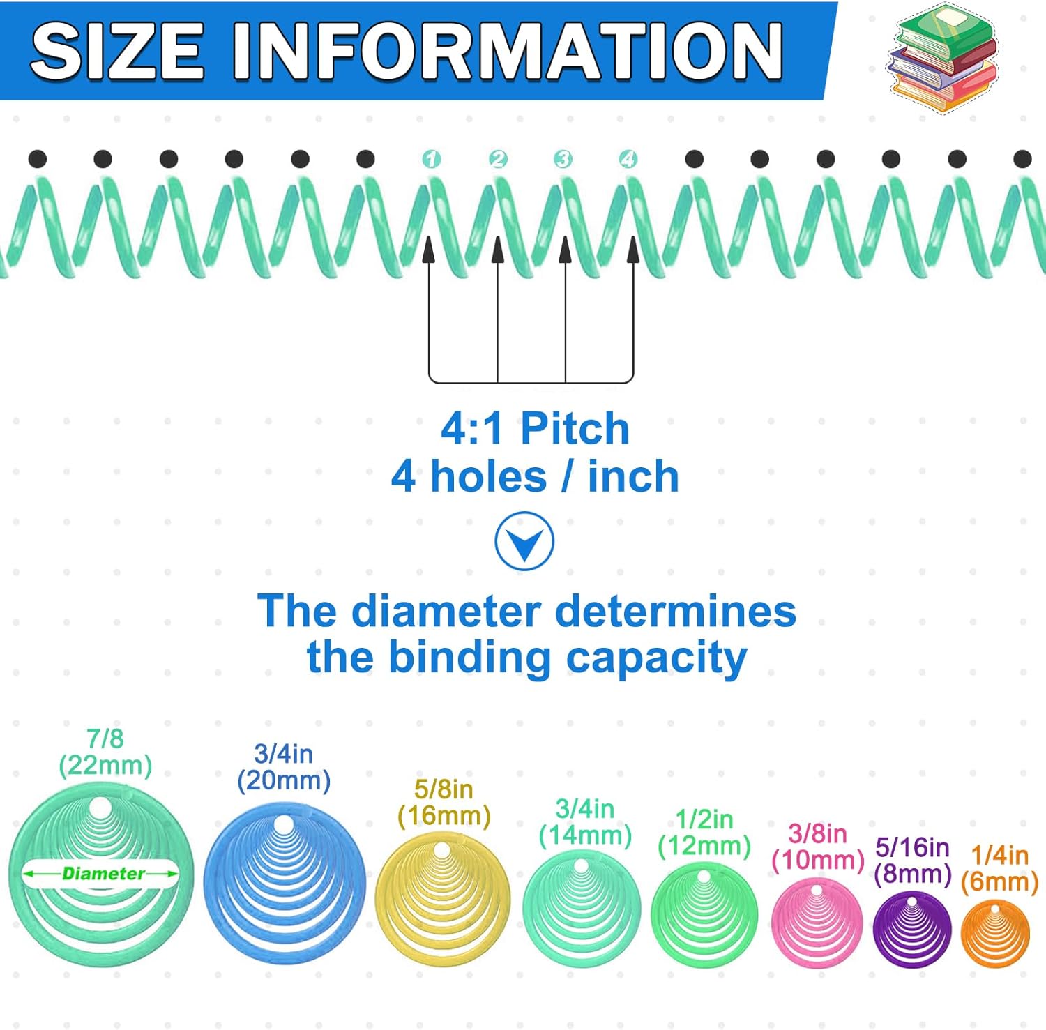 - 【4:1 Pitch & 48 Loops】Spiral Binding Coils (48 loops) are designed with a 4:1 pitch, fit any 4-holes-per-inch coil-binding machine, and letter paper is 8.5 x 11.0 inches. It helps to combine the report pages, calendars, documents, and more, providing much convenience to daily work or study. Their 4:1 pitch matches the 4-holes-per-inch punching pattern on the side of your book.