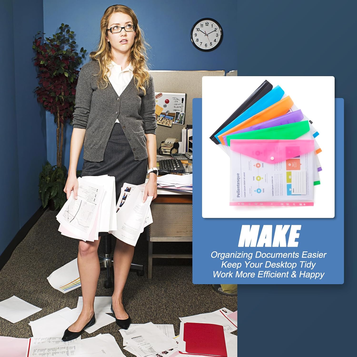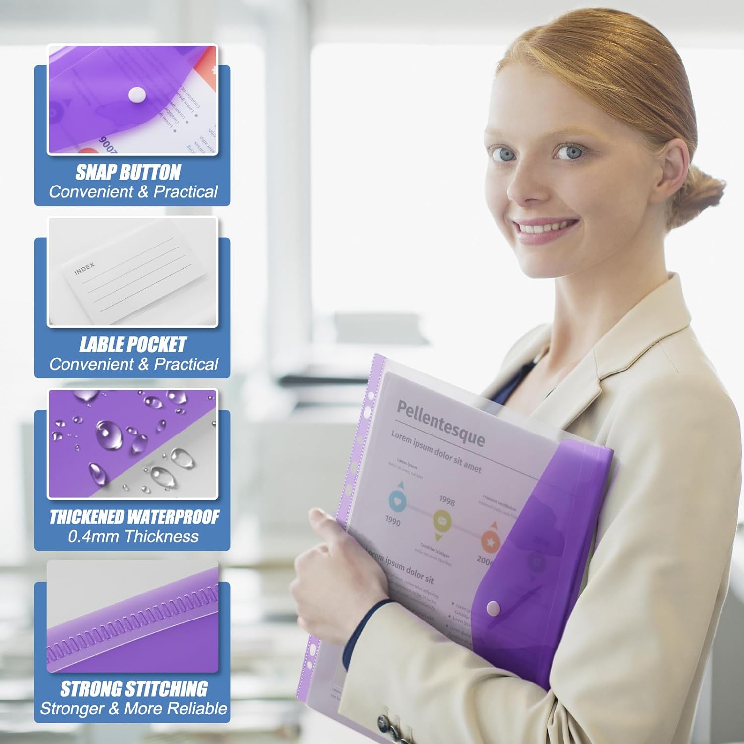 Binder Pocket Organizer Folders, 12 Pack Expandable Files Bag Plastic Envelopes Binder Folders with 11 Holes for 2/3/4 Ring Binder, Document Pouch with Snap Button and Label for School Office Home