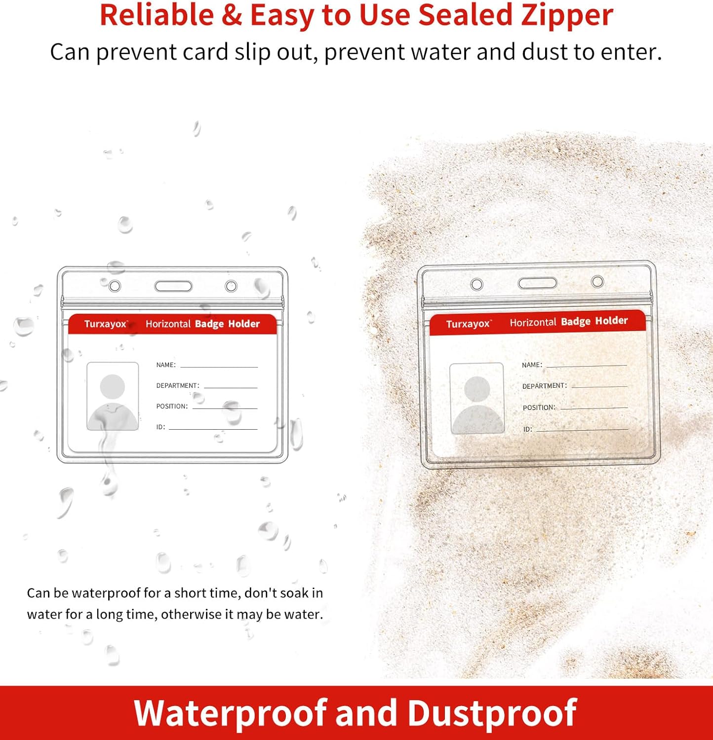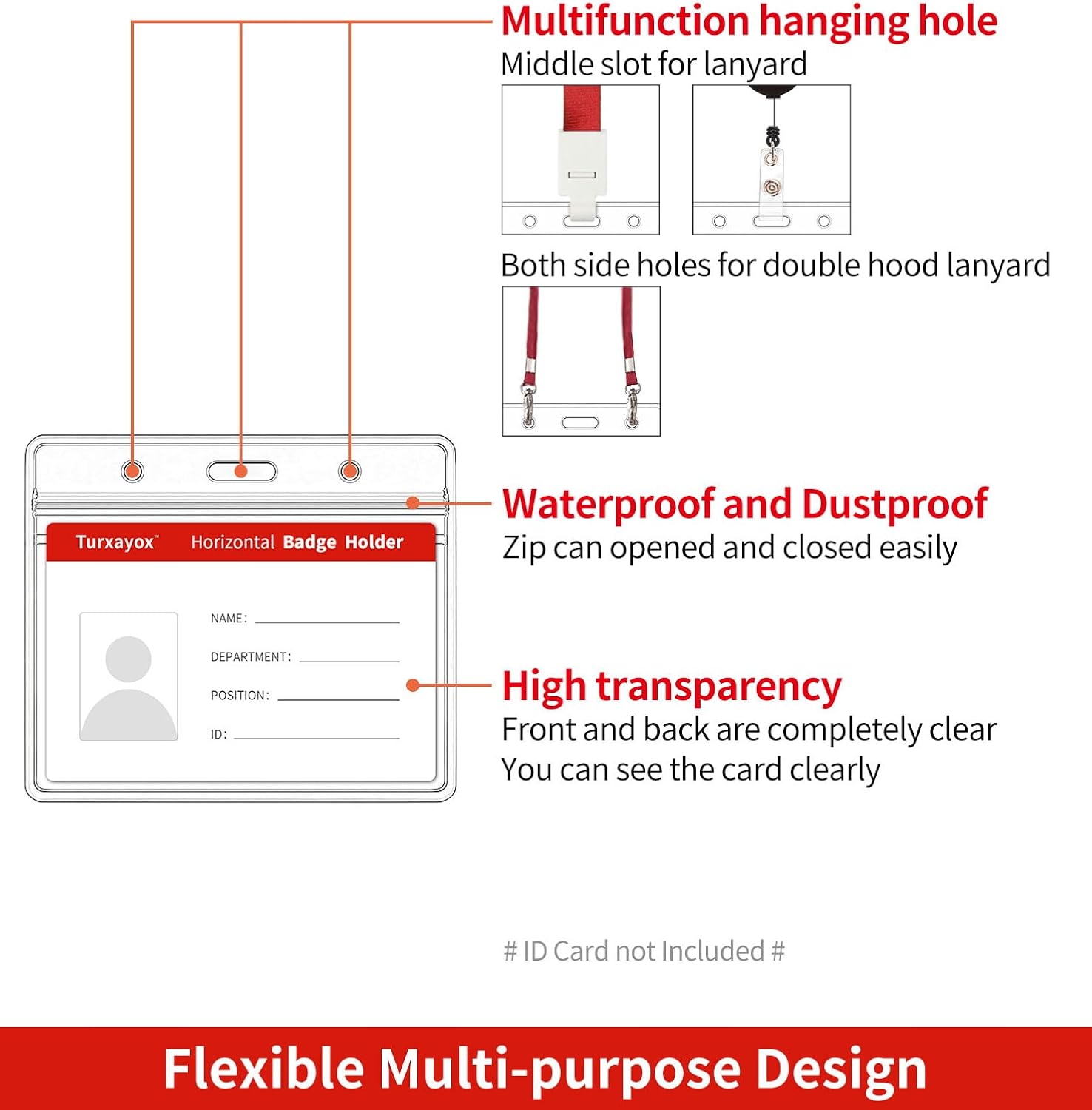- Flexible Multi-purpose Design: Our clear ID card holder features a resealable zip, making it waterproof and dustproof, ensuring the safety and dryness of your cards and money. The dual-use hanging slot/holes design allows you to easily attach a badge lanyard, keychain, or retractable carabiner reel clip. The side holes can be used for attaching a strap, cord, string, or thread