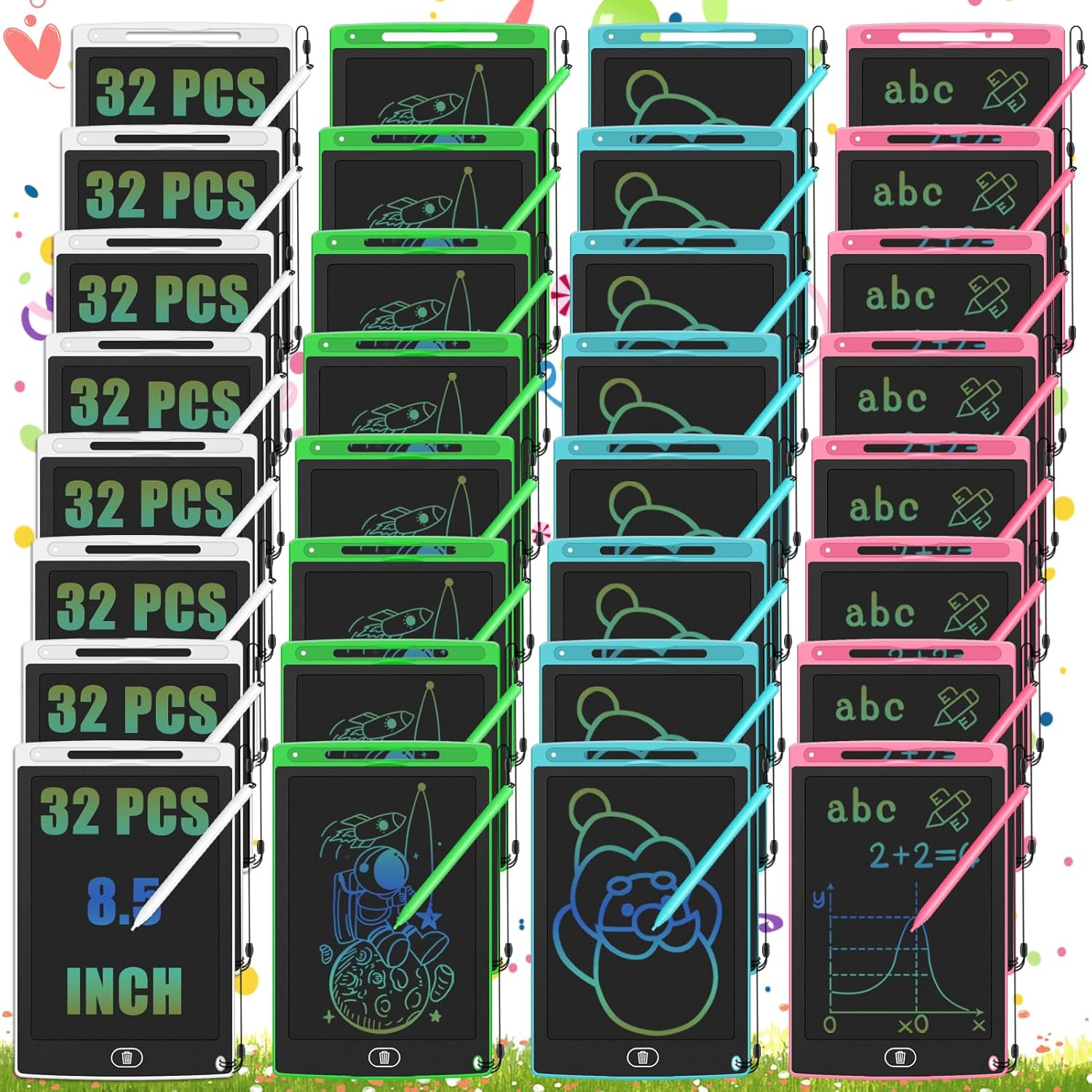 - Abundant 8.5 Inch Writing Tablet for Kids: 32 pcs drawing tablets bulk for kids in red, pink, blue, and green. LCD drawing pad cost-effective and easy to use for class learning activities. The LCD writing tablet can be used as party favors for kids, kids can use it to share wishes with friends at parties or even weddings.