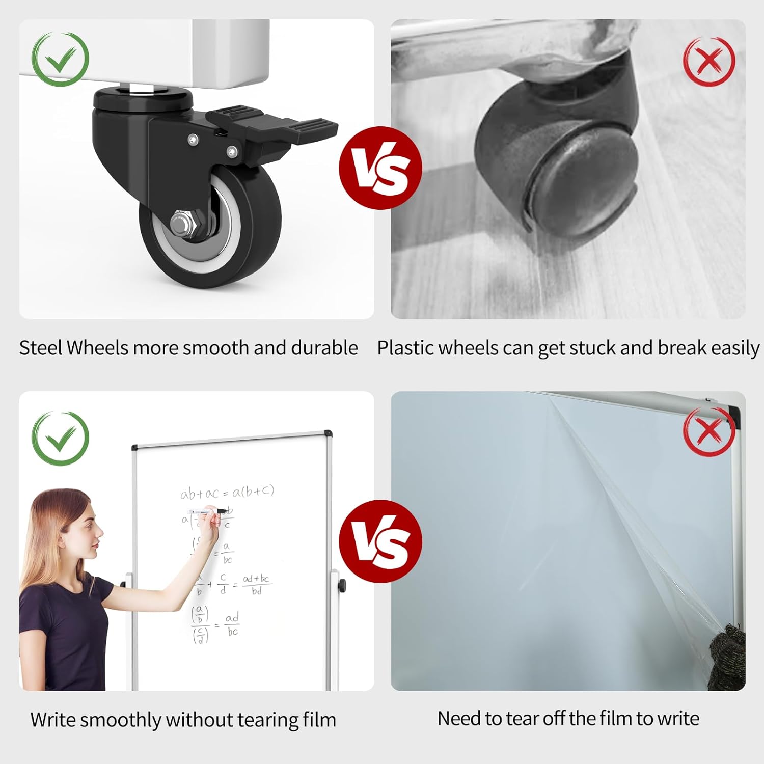 - Strong Construction and Portable Movement: Featuring a robust frame and four steel casters with brakes, our whiteboard allows effortless 360° rotation and movement. Securely lock it in place with the brakes for stable use.