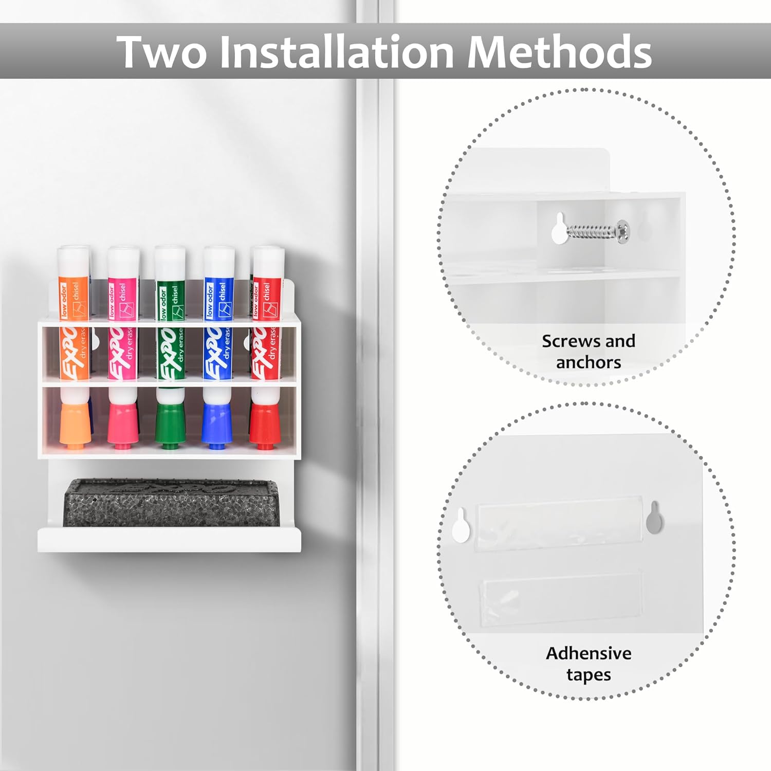 - 【Versatile Application】Crafted from high-quality white acrylic material, our wall mounted dry erase marker and eraser organizer will perfectly fit classrooms, conference rooms, or home. This whiteboard marker holder could meet all you need in the classroom organization, making all your markers, pens, pencils, erasers, office accessories well-organized.
