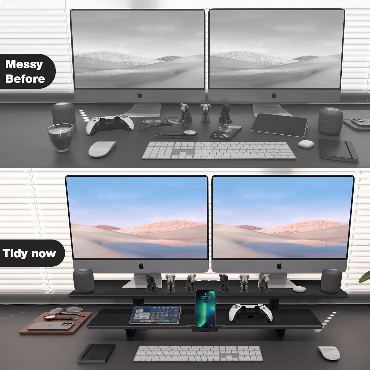- 【2 Tier Desktop Organizer】After repeated design by the designer, the final selection of 37 inch width, in line with more than 95% of the desktop, with enough width and space. This monitor riser is big enough to support two monitors. You can easily store your office accessories & supplies under your monitor stand to keep your desktop tidy. This monitor stand rise comes with cable management slots that can keep the wires clean and orderly.