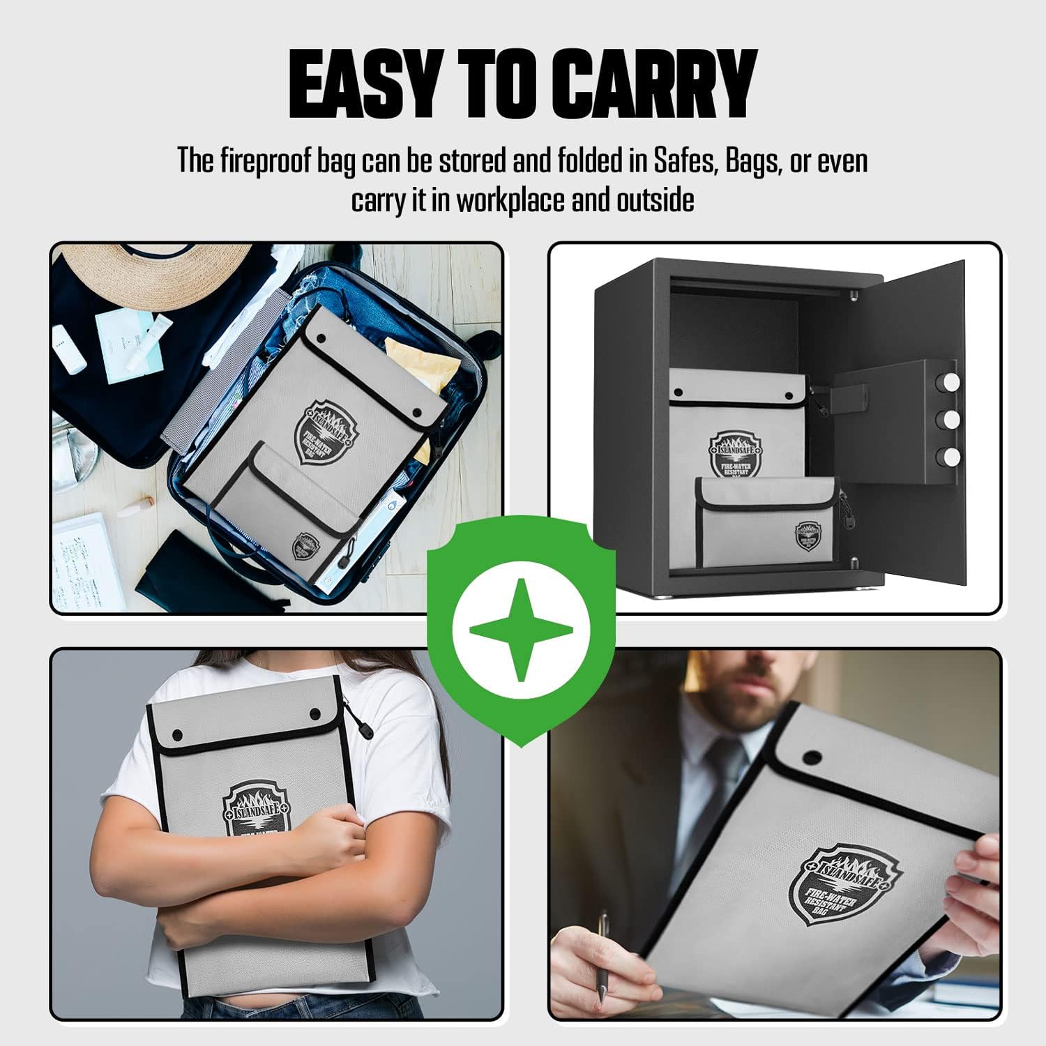 - 🔥【FOLDABLE AND PORTABLE】Fireproof document bag is lightweight and can be easily folded, makes it easy to grab and carry on-the-go no matter at home, office or business traveling. Combining the use of fireproof money bag with fireproof safe box together is the best solution to offer your documents and valuables a complete protection in any fire accident.