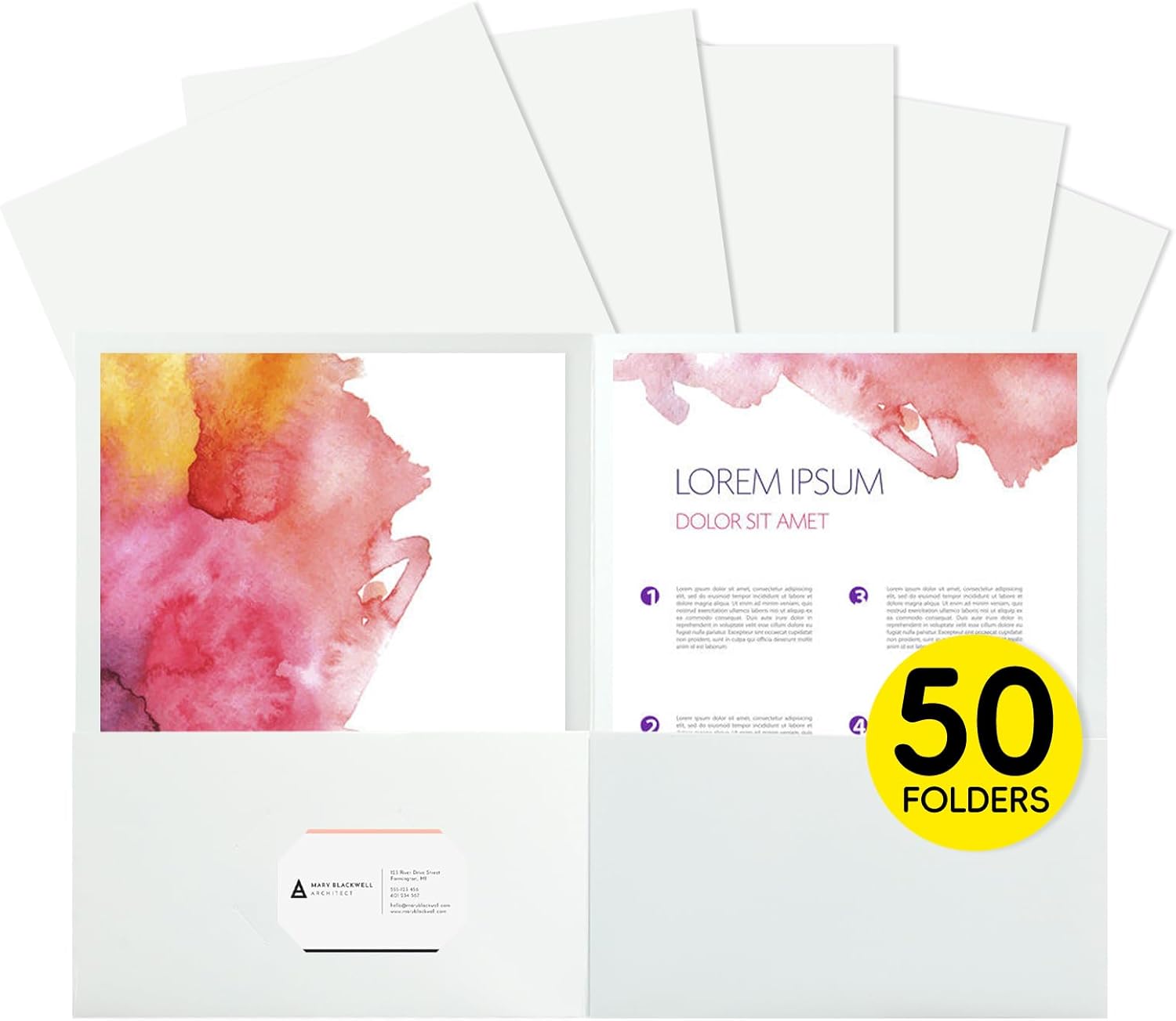 50Pcs White Folders with Pockets and Business Card Holder,2 Pocket Folders for School,Home or Office,Durable Heavy Duty File Folders