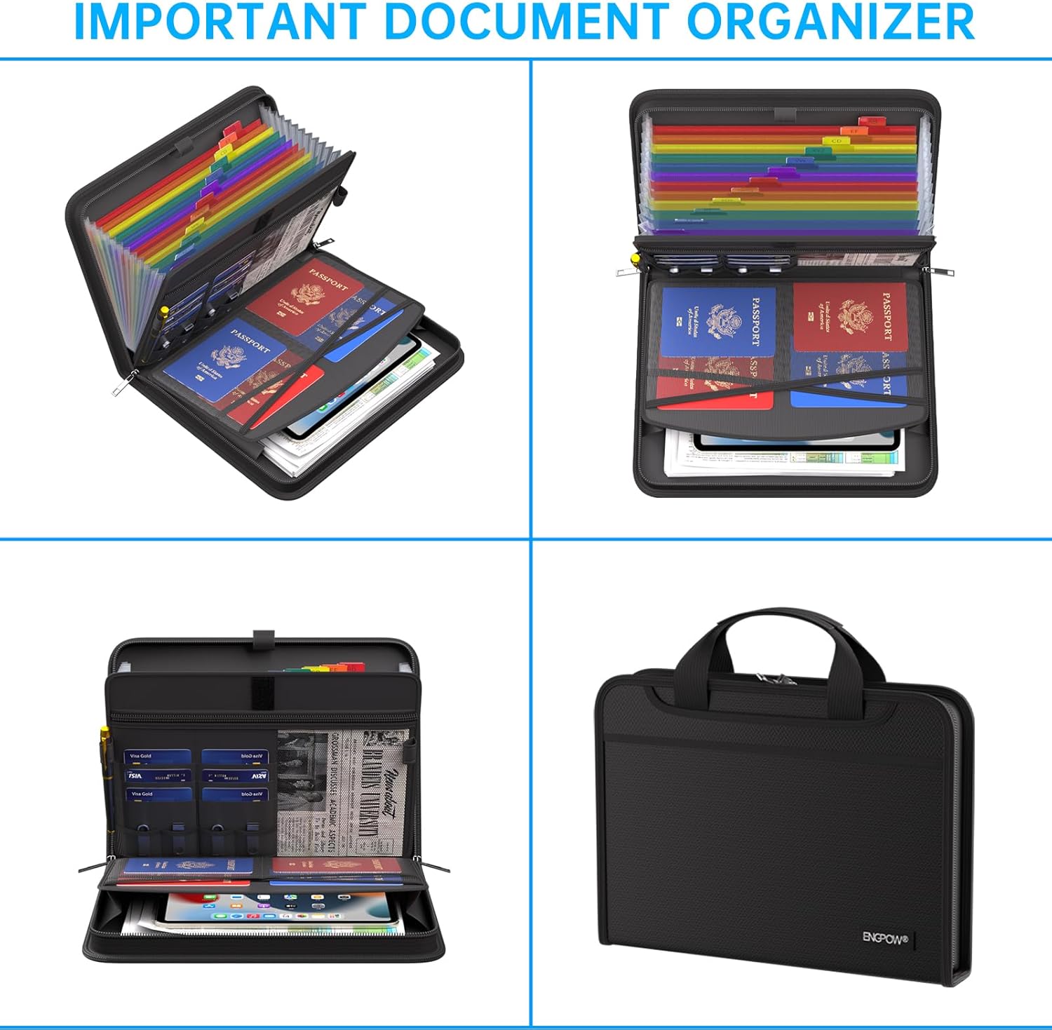 - Accordion File Organizer: A Safe Enough Folder to Keep Your Files. Say goodbye to cluttered files and disorganization with ENGPOW's file organizer folders. Compared with other folders,our fireproof folders is allows you to neatly store and classify letter/A4 files, receipts, cards, USB drives, pen, passports and more in a safe and orderly way. Perfect for daily file filing and storage.The Non-dusty material can prevent dust from sticking to the outside of our folder,always keep it neat and tidy.