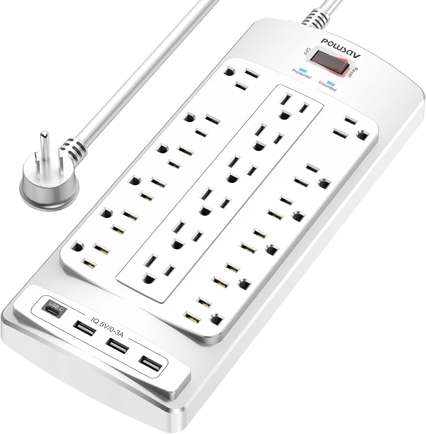 18 Outlets Surge Protector Power Strip - 6 Feet Flat Plug Heavy Duty Extension Cord with 18 Widely Outlets and 4 USB Ports, 2100 Joules, White, ETL Listed
