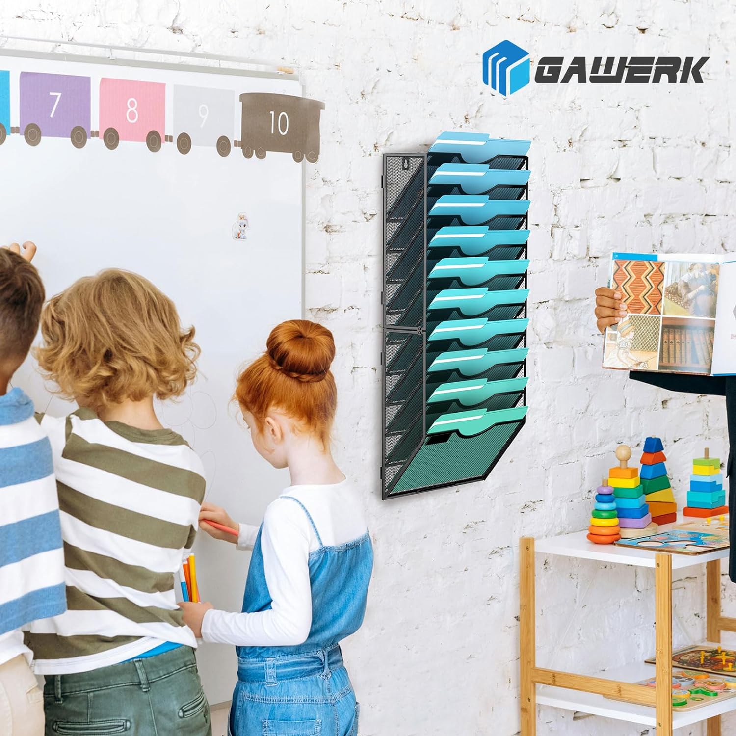 10-Tier Wall File Organizer Hanging Wall File Holder Wall Mount Paper Folder Organize, Mesh Magazine Document Mail Organizer Wall Organizer for Office School Home, Black