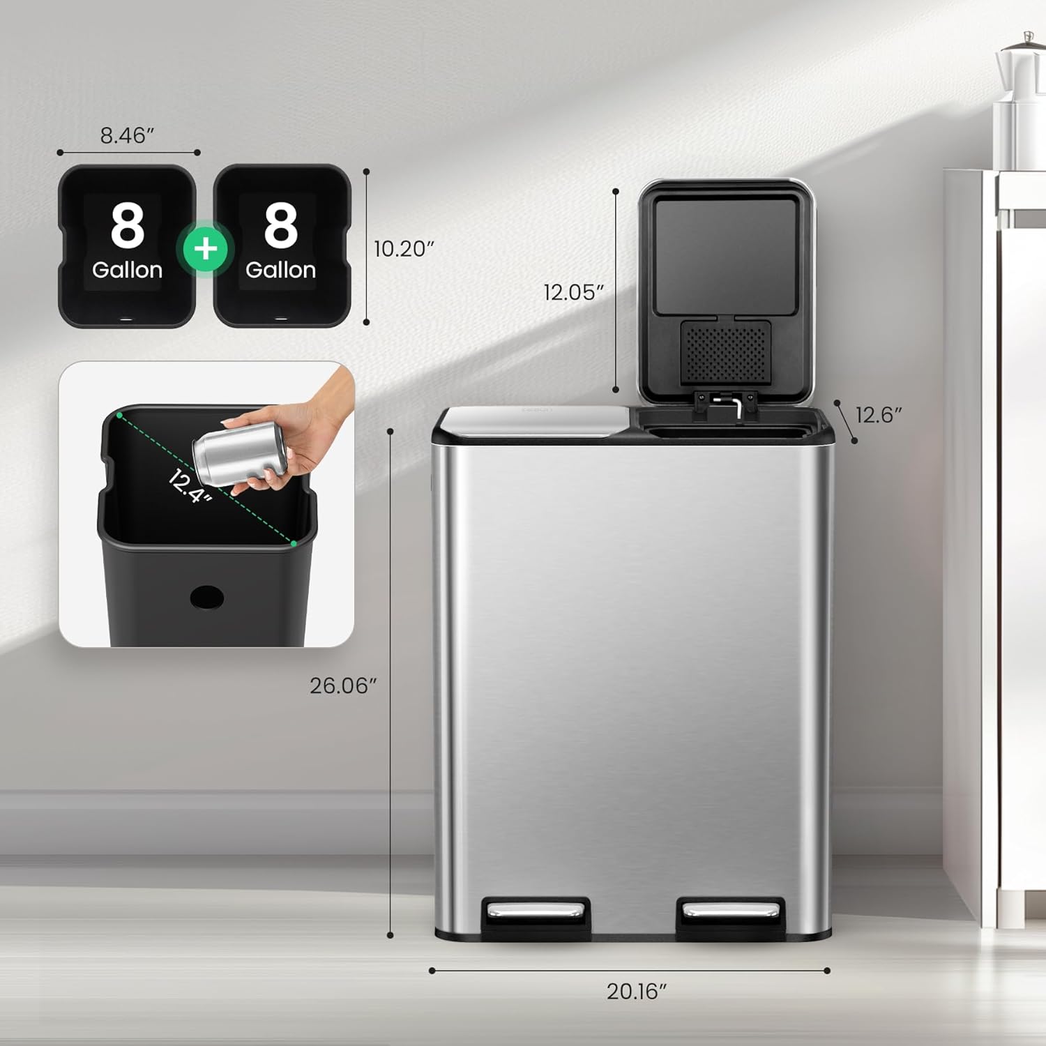 - Quality Stainless Steel: Experience a sleek, modern look of our kitchen trash bin while resisting fingerprints and rust. This dual trash and recycling bin combo allows for effortless cleaning and maintains its beauty over time, making it an ideal choice for any kitchen