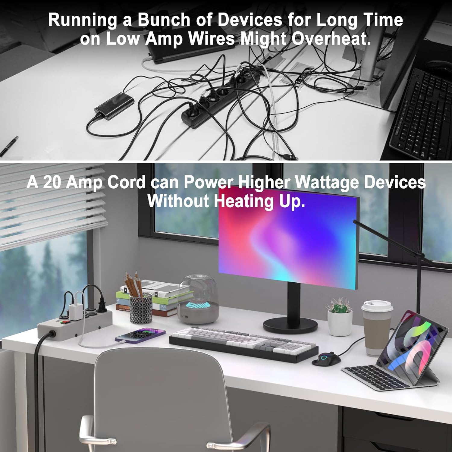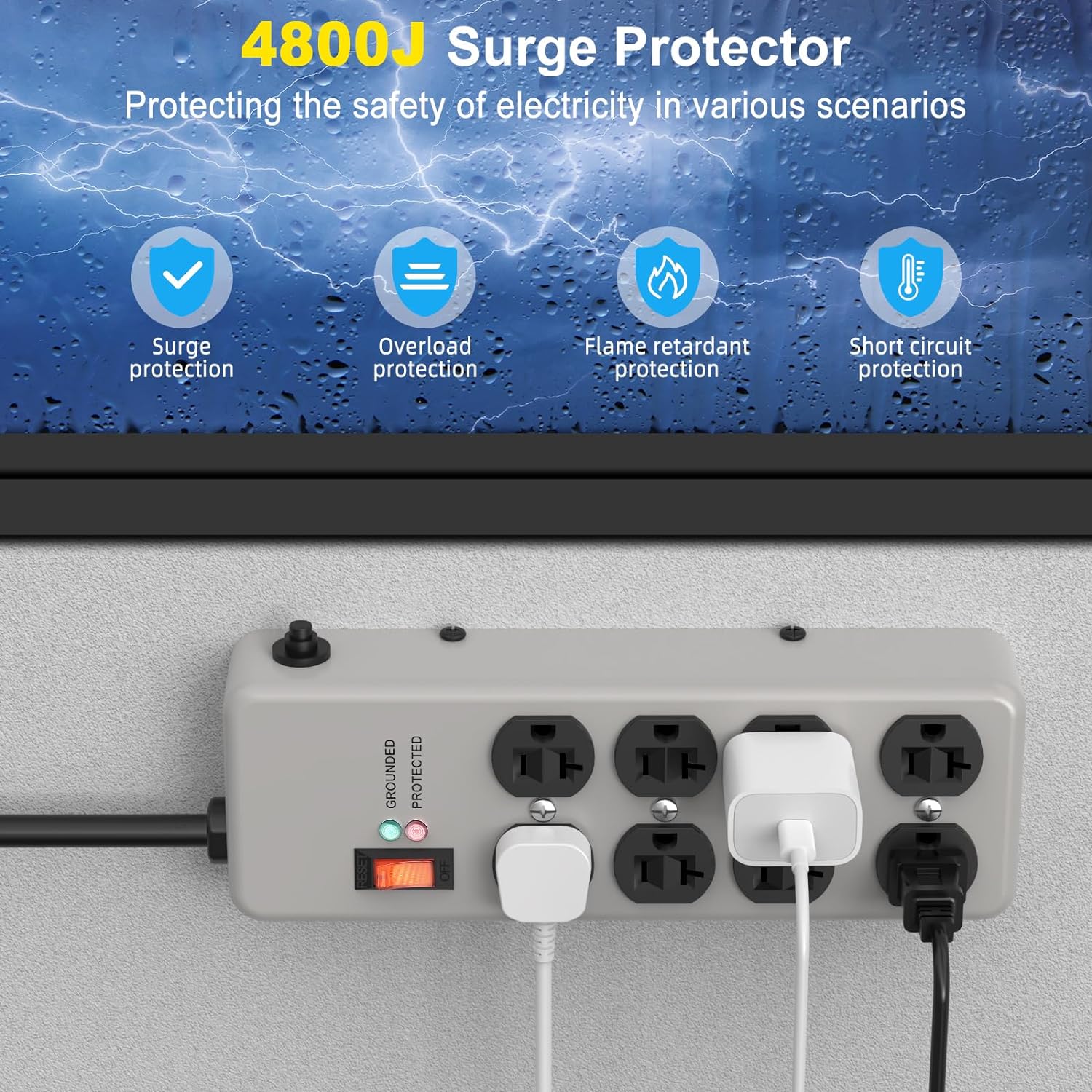 - Powerful Performance: This power strip comes equipped with 8 AC outlets, capable of delivering a high current of 20 Amp/125V/2500W. It includes a 6ft heavy-duty extension cord with a 5-15P plug, ensuring a reliable power supply for various devices.
