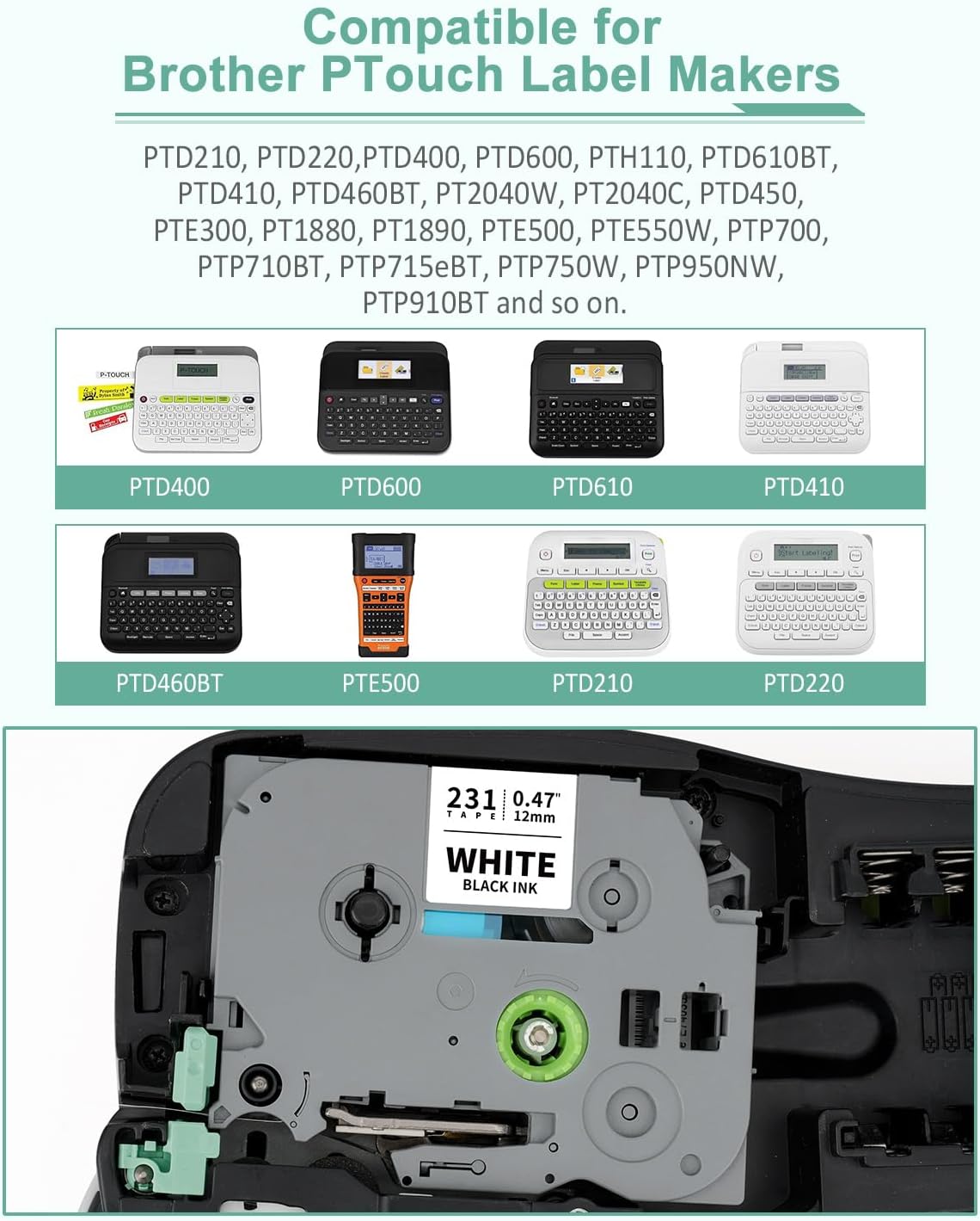 - Compatible with Brother P touch 24mm Label Makers: PTD610BT, PTD610BTVP, PTD600, PTP700, PTP710BT, PTE550W, PTP750W, PTE500, PTH500, PTP715eBT, PTD800W, PTE800W, PTP900, PTP900W, PTP950NW, PTP910BT, PT1500PC, PT1600, PT1650, PT2300, PT2310, PT2400, PT2410, PT2430PC, PT2500PC, PT2600, PT2610, PT2700, PT2710, PT2730, PT7500, PT7600, PT3600, PT9200DX, PT9200PC, PT9500PC, PT9600, PT9700PC, PT9800PCN