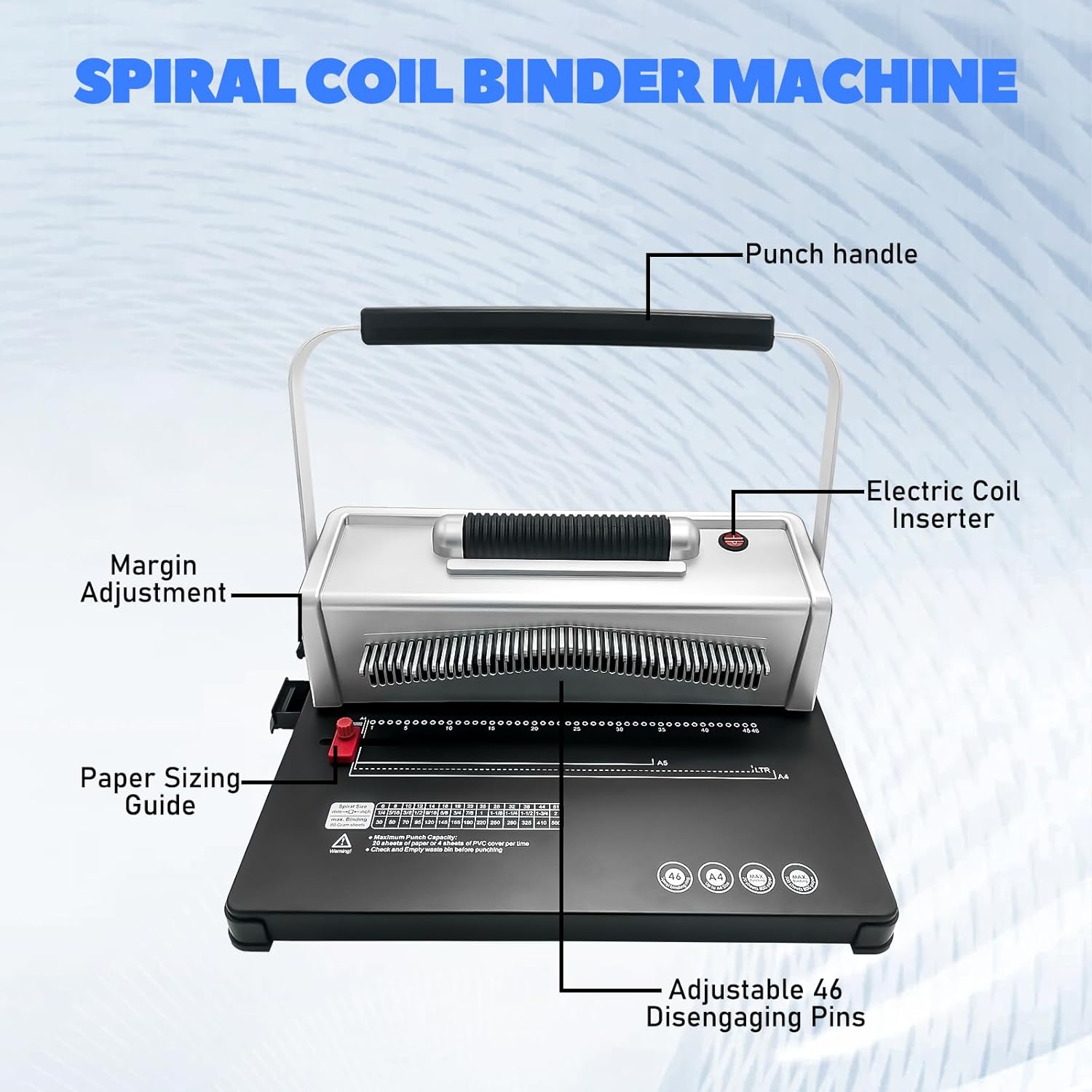 Coil Spiral Binding Machine,46 Holes Spiral Coil Binder with Electric Coil inserter,Manual Book Maker Punch Binder with 100pcs Plastic Coil and Plier