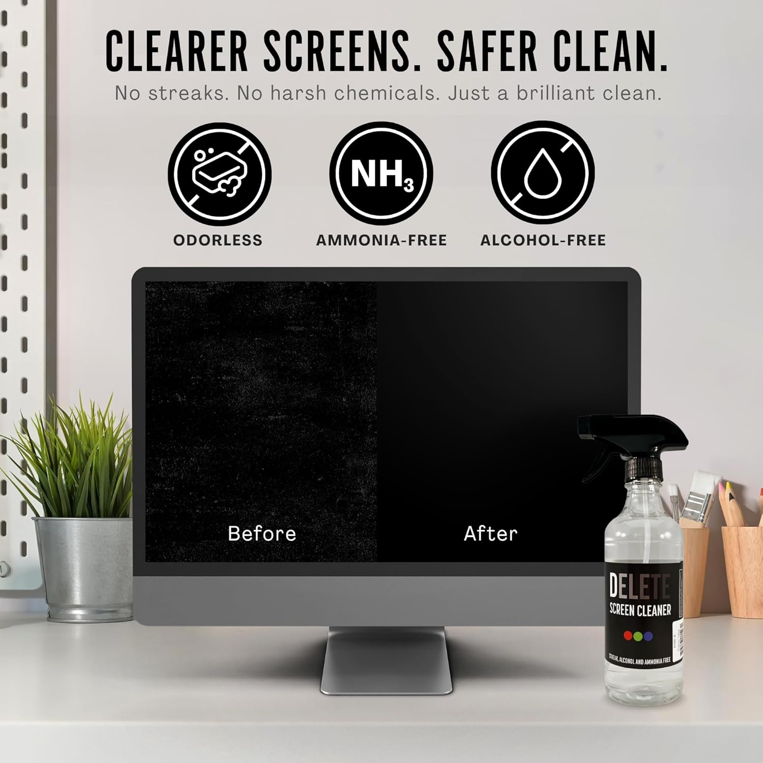 Delete Screen Cleaner Spray Kit, 16oz Bottle and 12"x12" Microfiber Cleaning Cloth, Streak-Free, Safe and Gentle Formula, Multi-Purpose for Devices, Large TVs, Computers, Monitors, Smart Phones