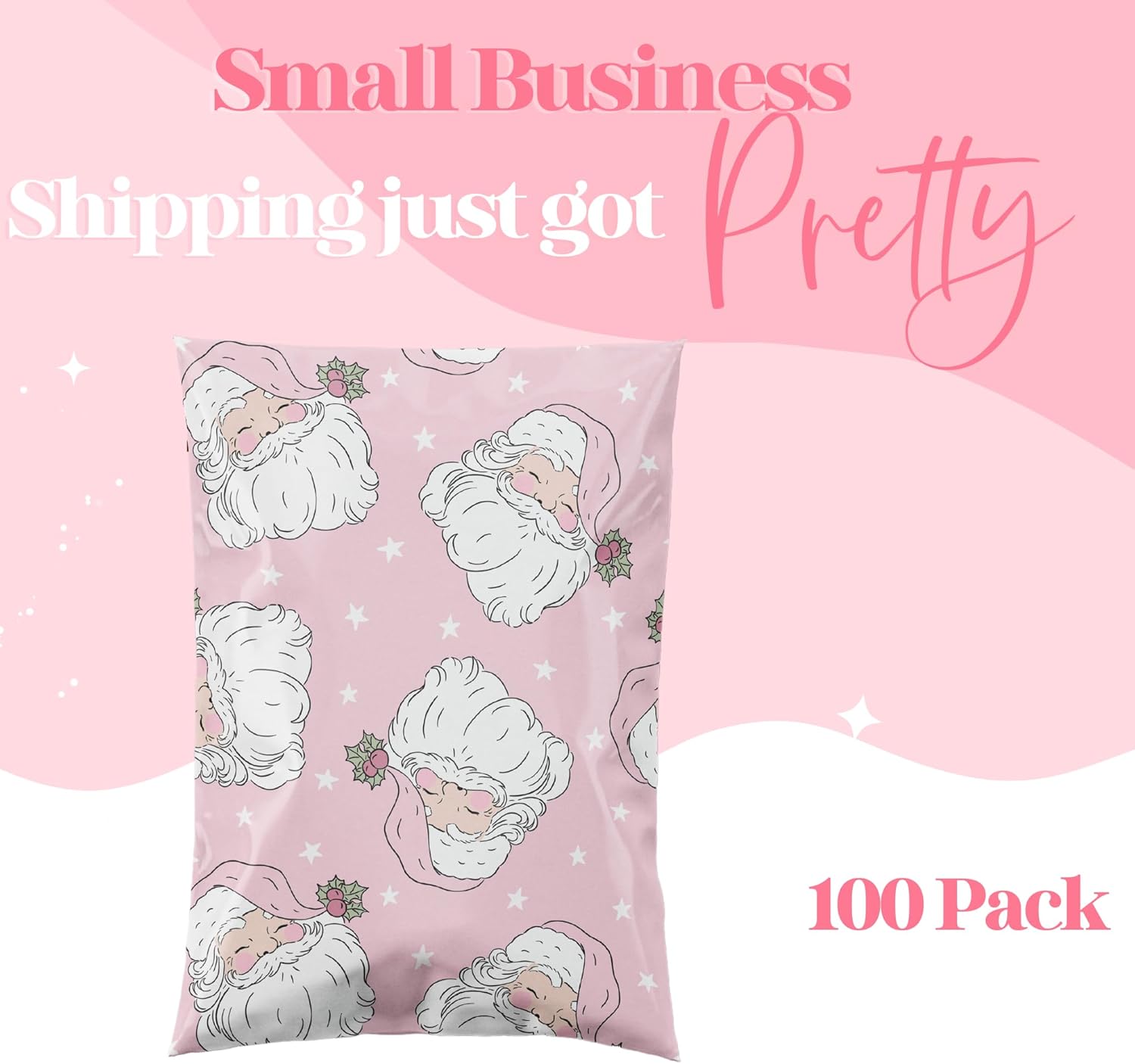 6x9 Designer Christmas Holiday Poly Mailers 100 Pack Heavy Duty Waterproof Self Seal Shipping Bags Large Mailing Envelopes Bulk Tear Resistant Cute Packaging Pink Santa