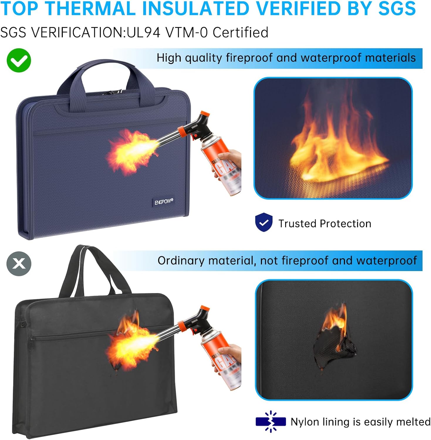 - High-Quality Materials: Protect your files with ENGPOW fireproof accordion file organizer.It is made of 3-layered non-itchy silicone-coated fiberglass which withstand the temperature up to 2200℉.It has been passed by SGS TEST(UL94 VTM-0 Certified).Fireproof File Folder is fireproof&Water-resistant,which can effectively protect your important documents in a fire,flood,and wet weather. They will further keep your files intact.Giving you time to save your important documents when disaster strikes