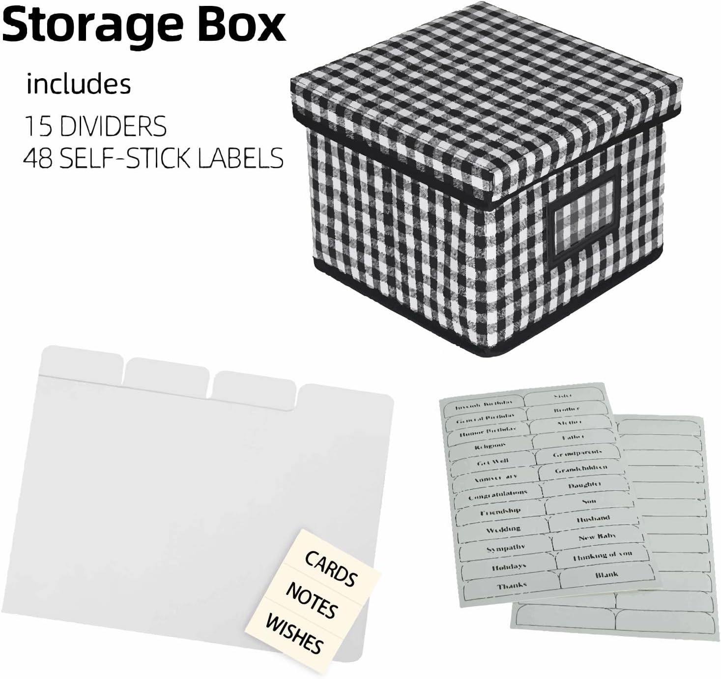 - Large Capacity Storage:The size of our greeting card box is 9.6"x9.1"x7.5“and can accommodate 140+ cards. It includes 15 dividers and 48 self-stick labels , you can organize your cards by calendar month or occasion