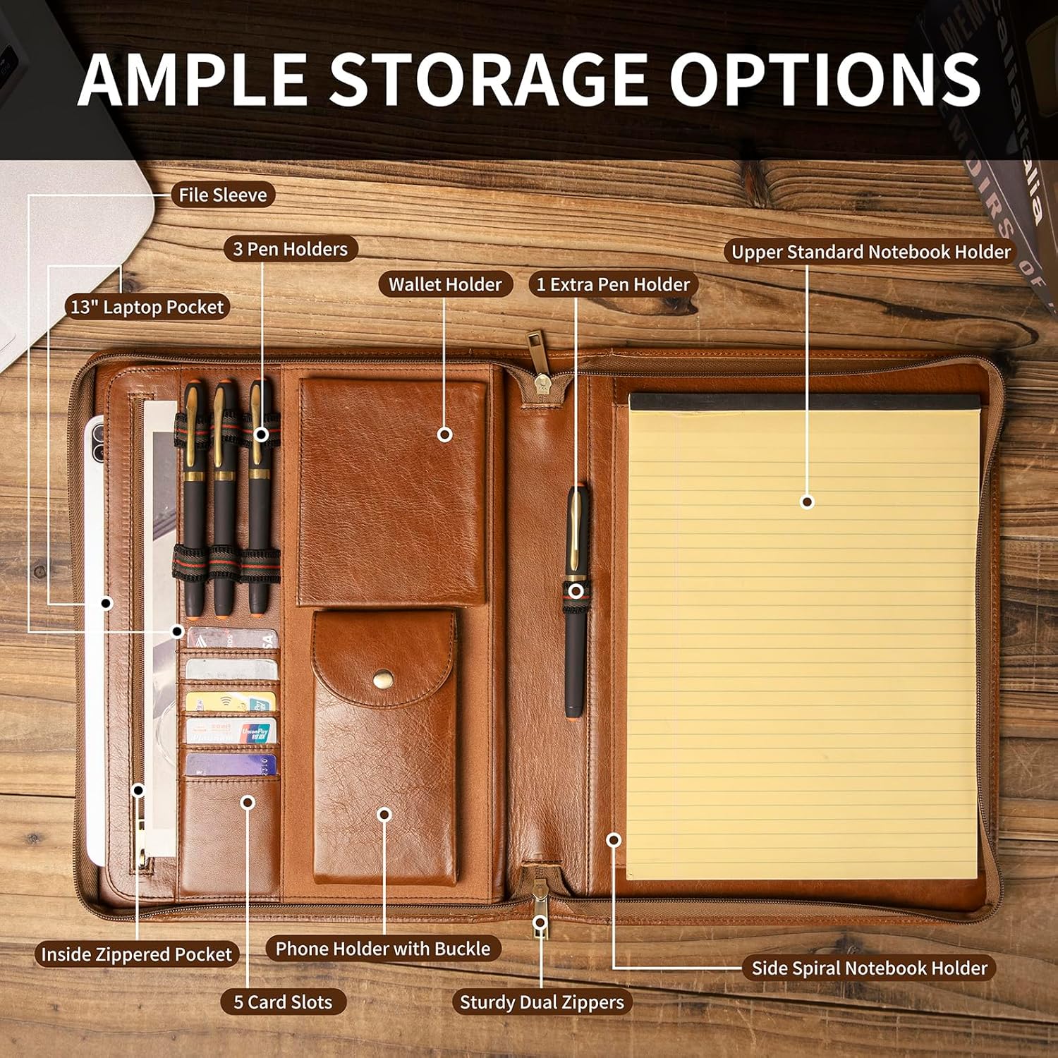 - Functional Storage: Side spiral notebook holder and upper standard notebook holder. Phone holder with buckle, wallet pocket, 4 pen holders, 5 card slots and inside zippered pocket. In addition to the exterior pocket, the inside 13” laptop pocket is large enough for a 13” laptop or 13.3” MacBook Pro (Not for 13.3” MacBook Air).