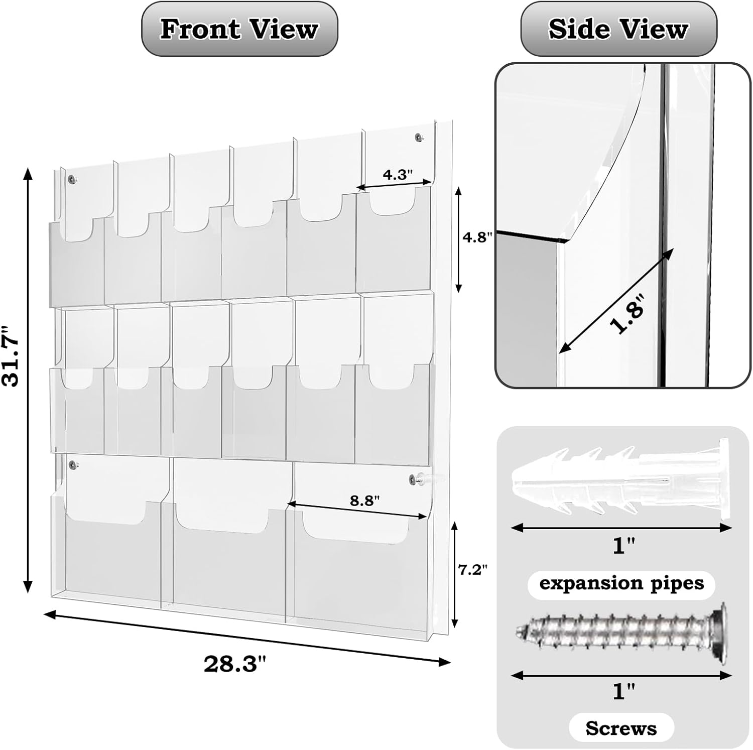 Acrylic Brochure Pamphlet Holder, 3 Magazine Holders and 12 Pamphlet Holders, Clear Brochure Display Holder Wall Mount, Trifold Flyer Rack, Literature Storage Rack for Home, Offices, Waiting Room