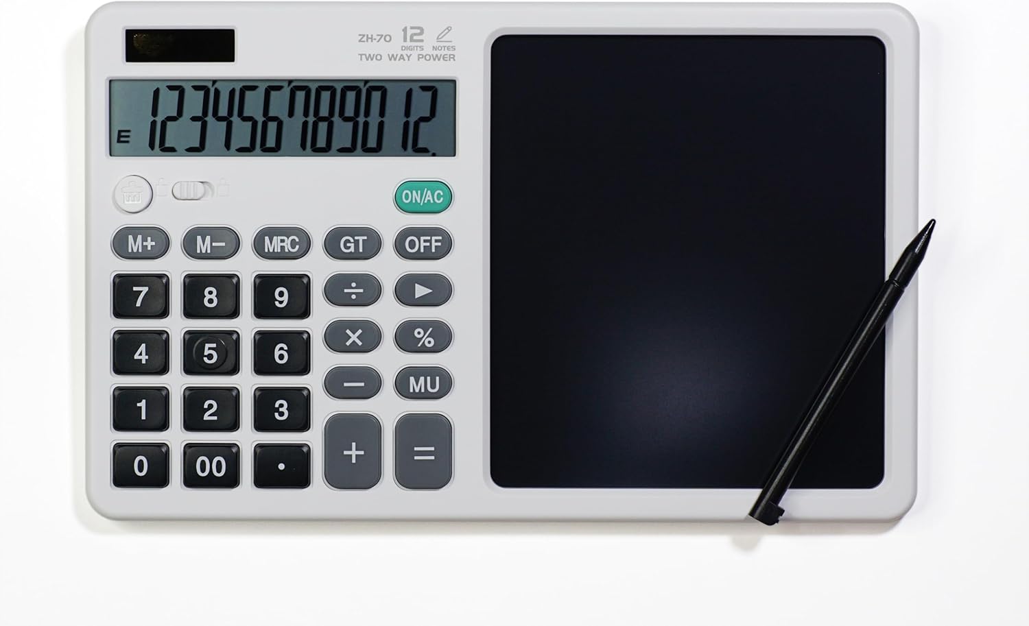 Desk Calculator Large Display with 7'' Erasable Writing Pad, 12 Digits Large Screen Display Jumbo Calculadora, Solar & Battery Powered Big Button Calculators for Business Office School, White