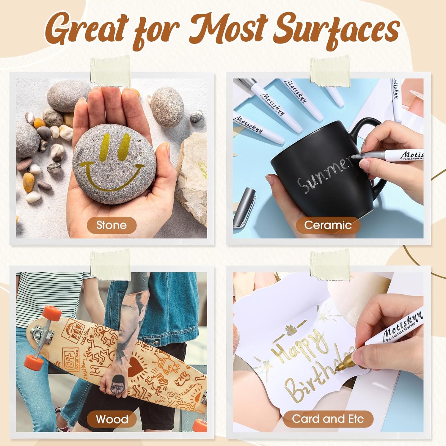 - Quality Material: metallic permanent markers are made of water based ink, The point is fine, the writing is smooth, the color is vibrant, and the metallic luster is emitted; Suitable for opaque light and dark surfaces