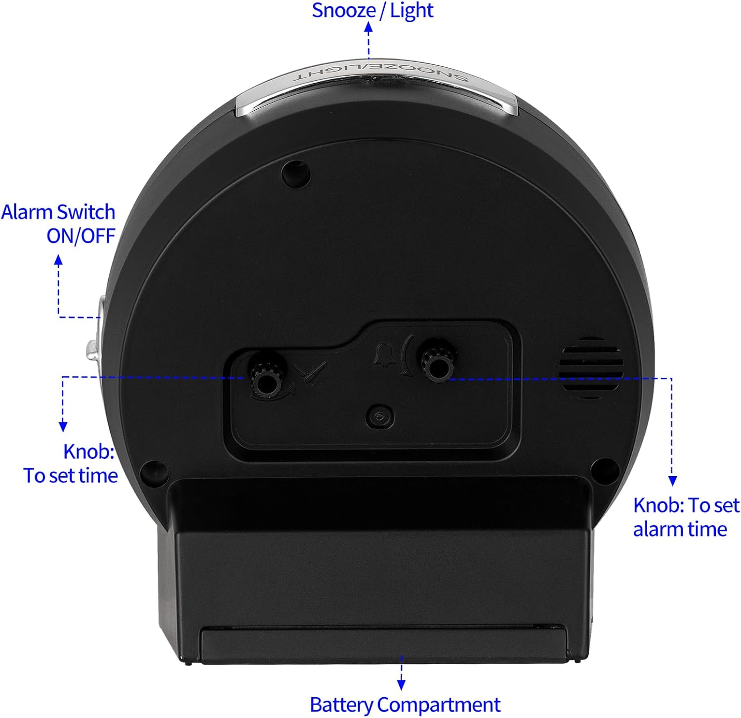 - Snooze Function--Want more sleep when the alarm goes off. Just press big snooze button on top to get extra 5 minutes sleep and you can snooze many times within 45 minutes.