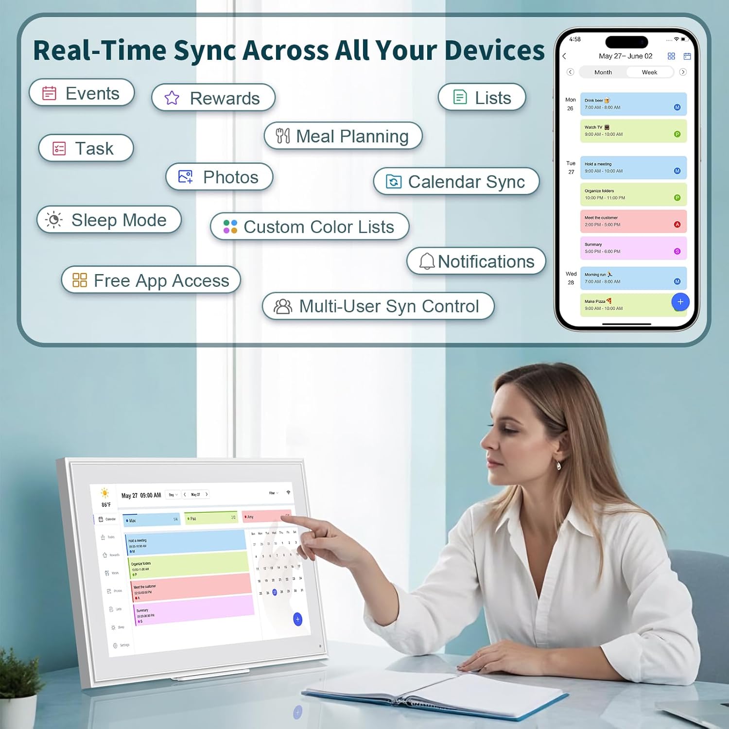 - 【Impressive Features】Simply plug in the device, connect to Wi-Fi and sync your calendars. Events will automatically populate and sync across all platforms, ensuring your family stays organized and no tasks are missed. Compatible with icloud Calendar, Google Calendar, Outlook Calendar, Cozi, and Yahoo, enabling seamless management and sharing of your schedule across all your devices.