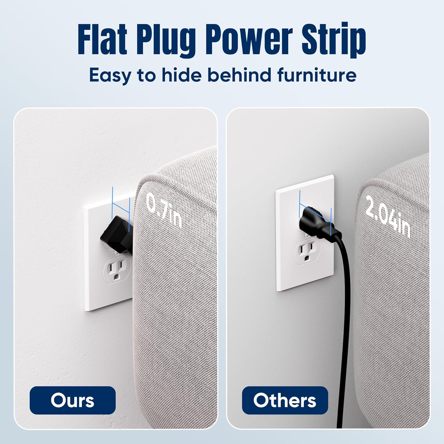 - 🏠【Space Saving Design】- Experience the ultimate in space efficiency with JouleLoom 10FT surge protector's slim flat plug, measuring a mere 0.7 inches thick. Unlike traditional plugs, its unique 45-degree right-angle design ensures it won't obstruct neighboring outlets. Plus, with two multi-directional hanging holes, you can easily mount it horizontally or vertically on workstations, walls, counters, bedrooms, optimizing your space like never before.
