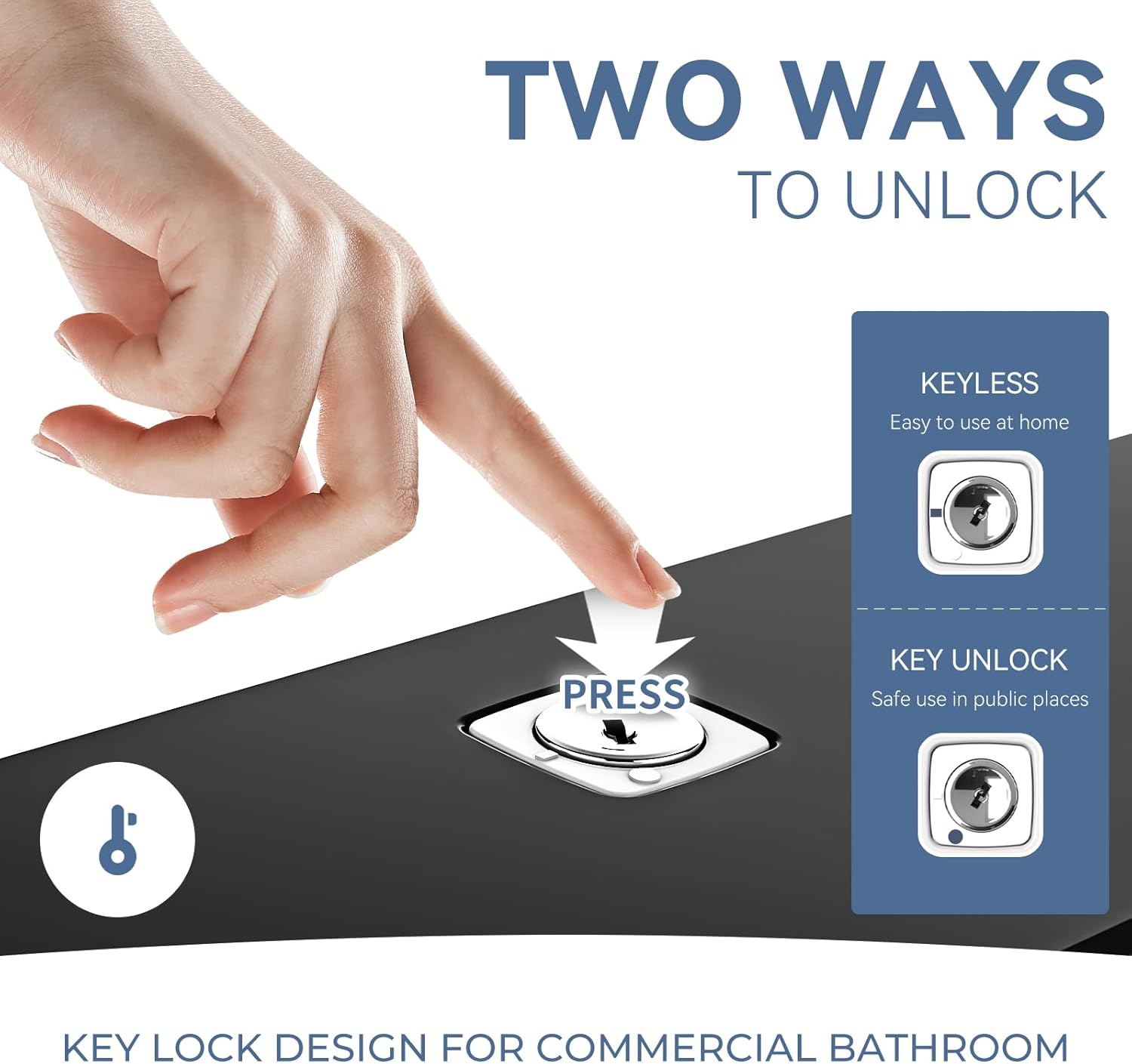 - 【TWO LOCKING DESIGN】 This wall mounted paper towel holder can be pressed to unlock, suitable for home kitchen or bathroom. It can also be locked with a key, suitable for commercial public places.