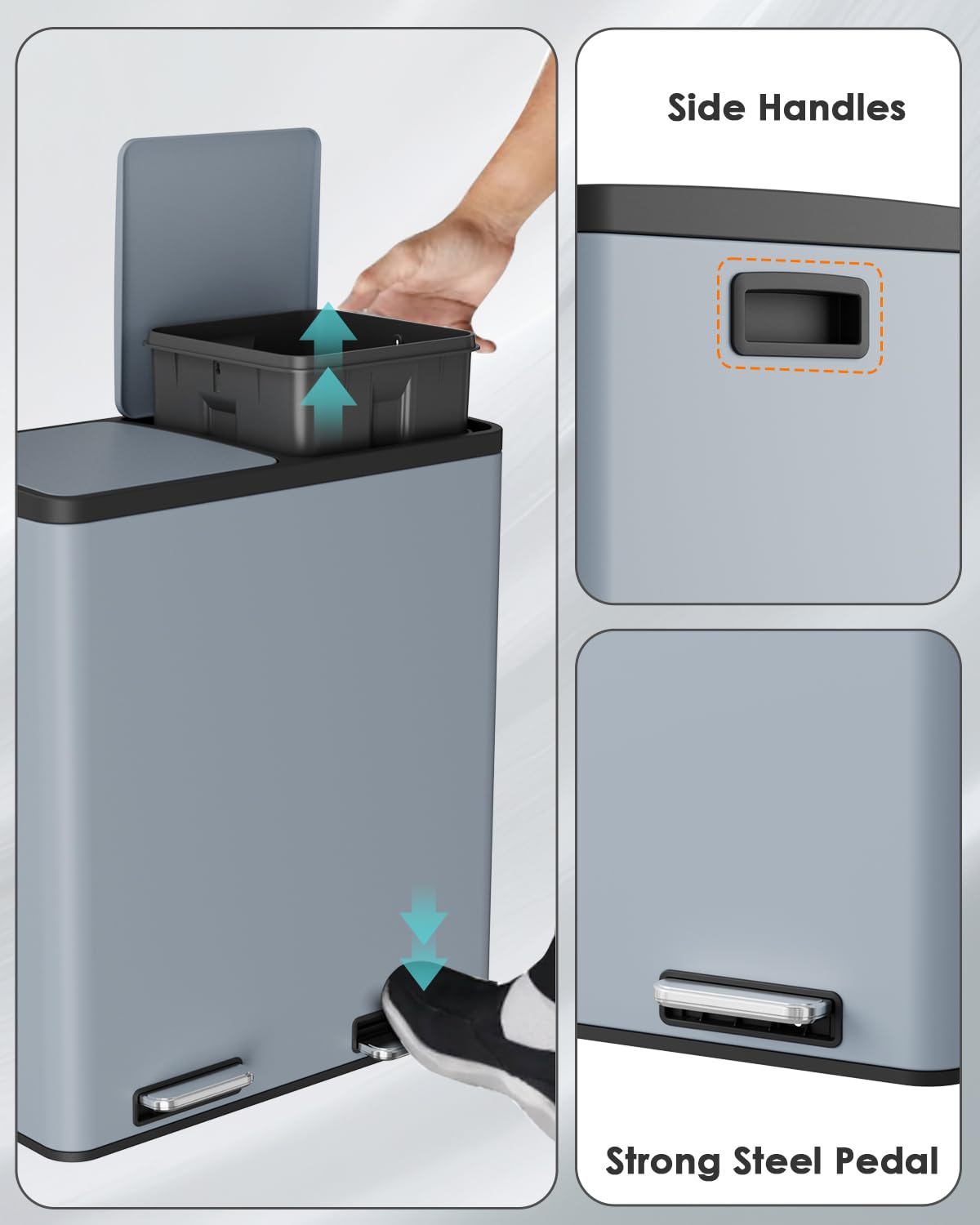 - WIDEN PEDAL&SIDE HANDLES: Dual trash can includes 2 non-slip metal pedals that can open 2 lids individually, free your hands and cleaner. With 2 portable side handles, we can move it easily.