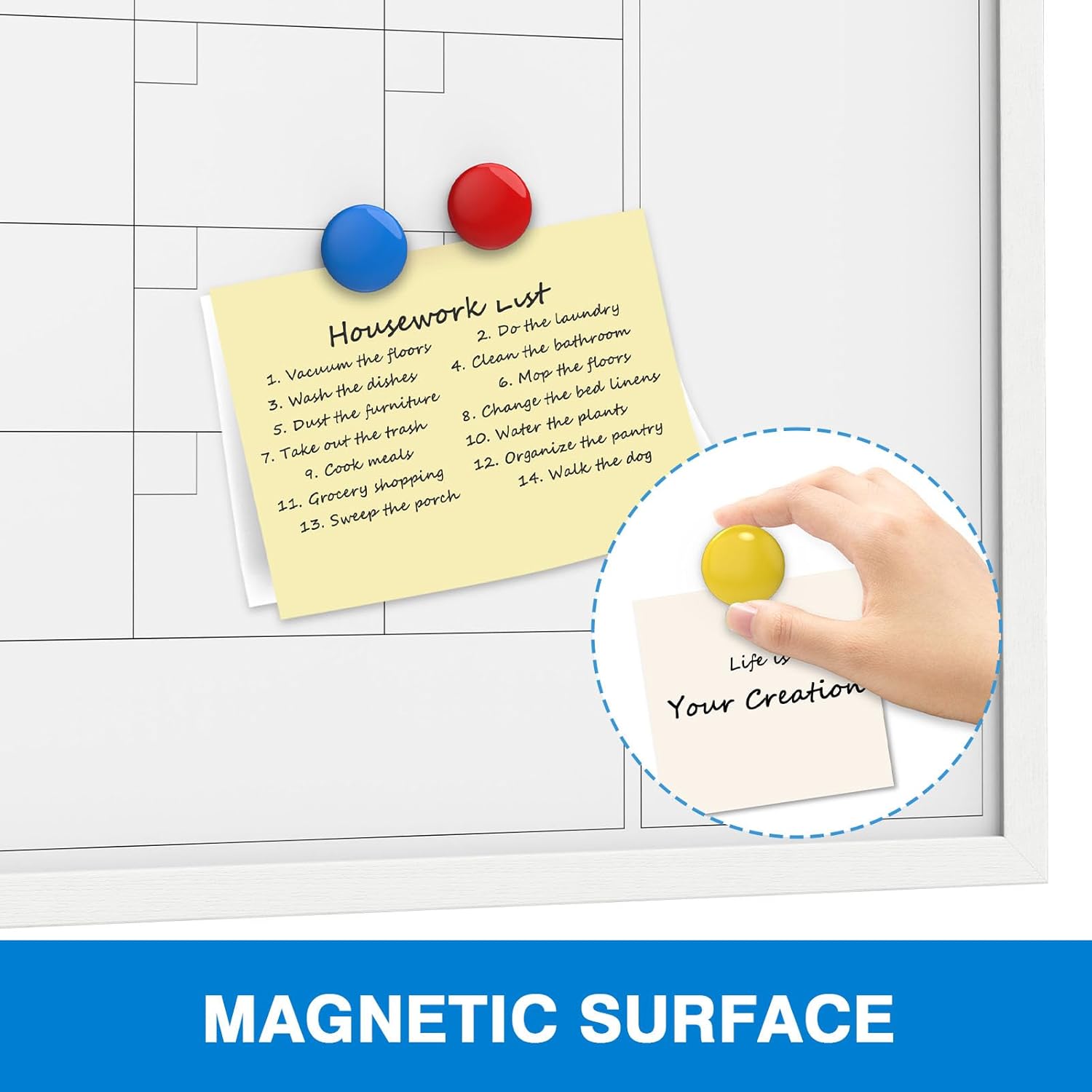 - 【Function Design】 The Dry Erase whiteboard has a calendar view, which makes it convenient and easy to track all the tasks and events of the family. There is also a note section, which is convenient for daily, weekly and monthly planning.It integrates a dry-erase calendar and a dry-erase whiteboard. It can magnetically attach Xnotes, photos, etc., and can also quickly jot down ideas and tasks, serving as a family activity center.