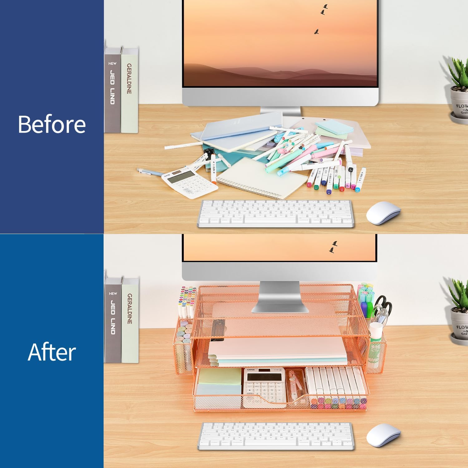 AUPSEN Computer Monitor Stands Riser,2-Tier Desk Organizers and Accessories, Office Desk Accessories Organizer with Drawers and 2 Pen Holder for Office Supplies (Rose Gold)
