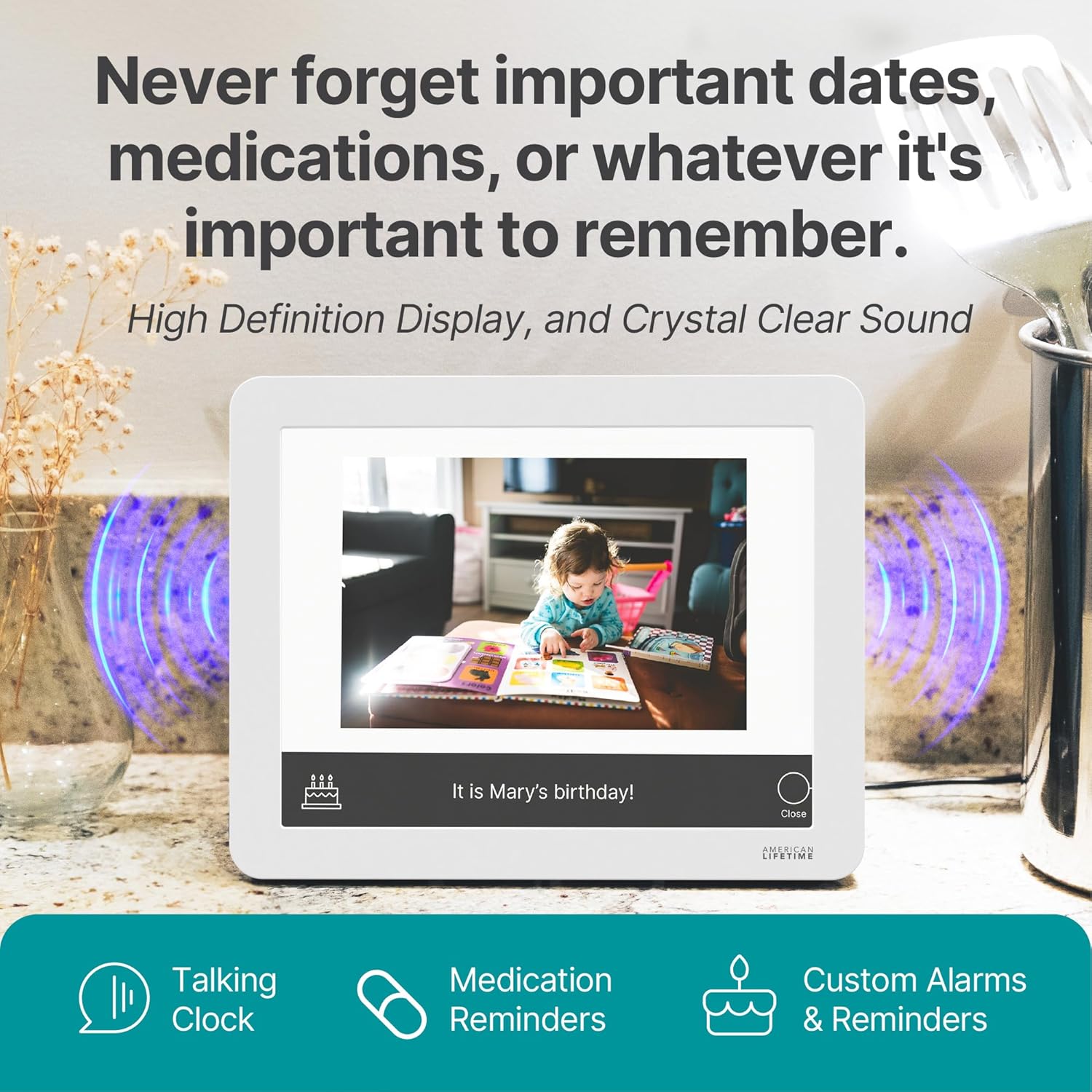 - Personalized Care: Create a personalized care routine with the American Lifetime Day Clock. Set unlimited custom alarms, reminders, and messages to help your loved one stay on schedule and never miss important events.