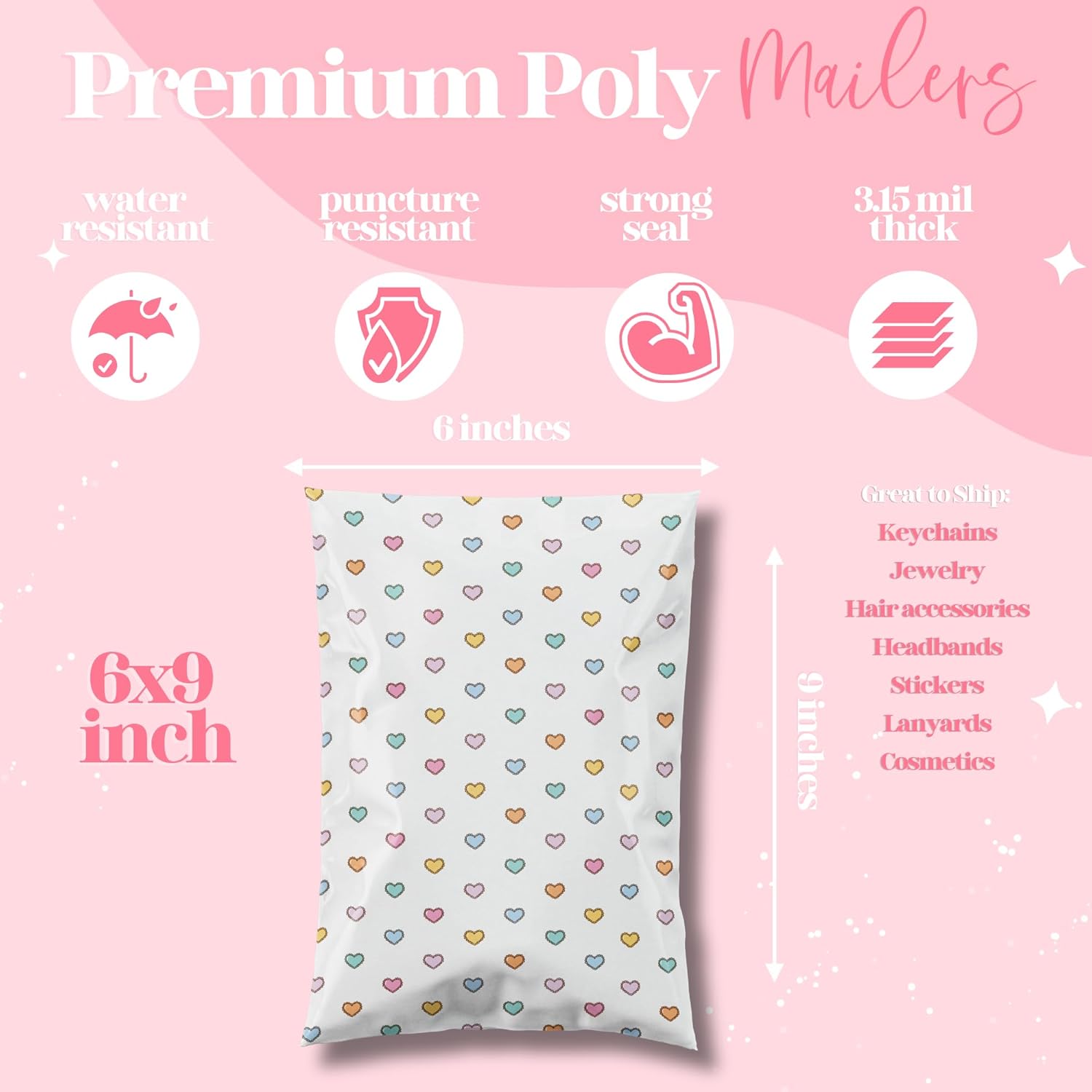 6x9 Designer Poly Mailer 100 Pack Heavy Duty Waterproof Self Seal Shipping Bags for Small Business Large Mailing Envelopes Bulk Tear Resistant Packaging Preppy Hearts