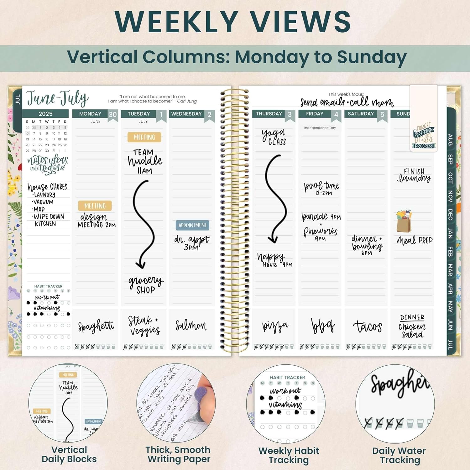 - Vertical Weekly Layout: The weekly views in this planner 2025-2026 run Monday to Sunday with even space for each day. Daily columns are 1.5” wide x 7.7” tall, perfect for tracking hourly appointments. Each week features a quote, top focus items, habit tracker, and daily water intake.