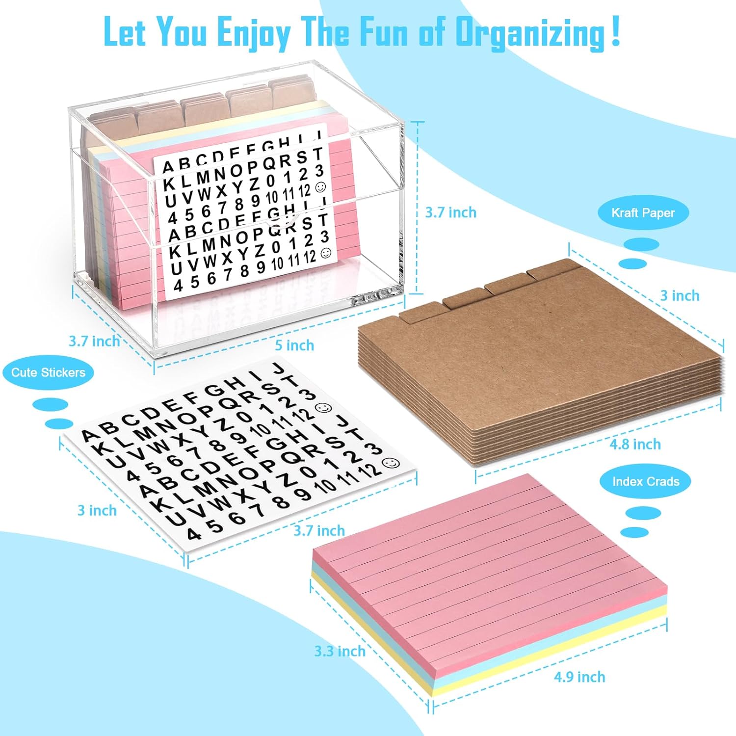 3 x 5 Inch Acrylic Index Card Holder Clear Flash Card Holder Recipe Card Box 150 Pcs Ruled Lined Index Cards 30 Pcs Kraft Dividers A to Z Stickers For Holds 400 A-Z Tabs Note Cards Business Cards