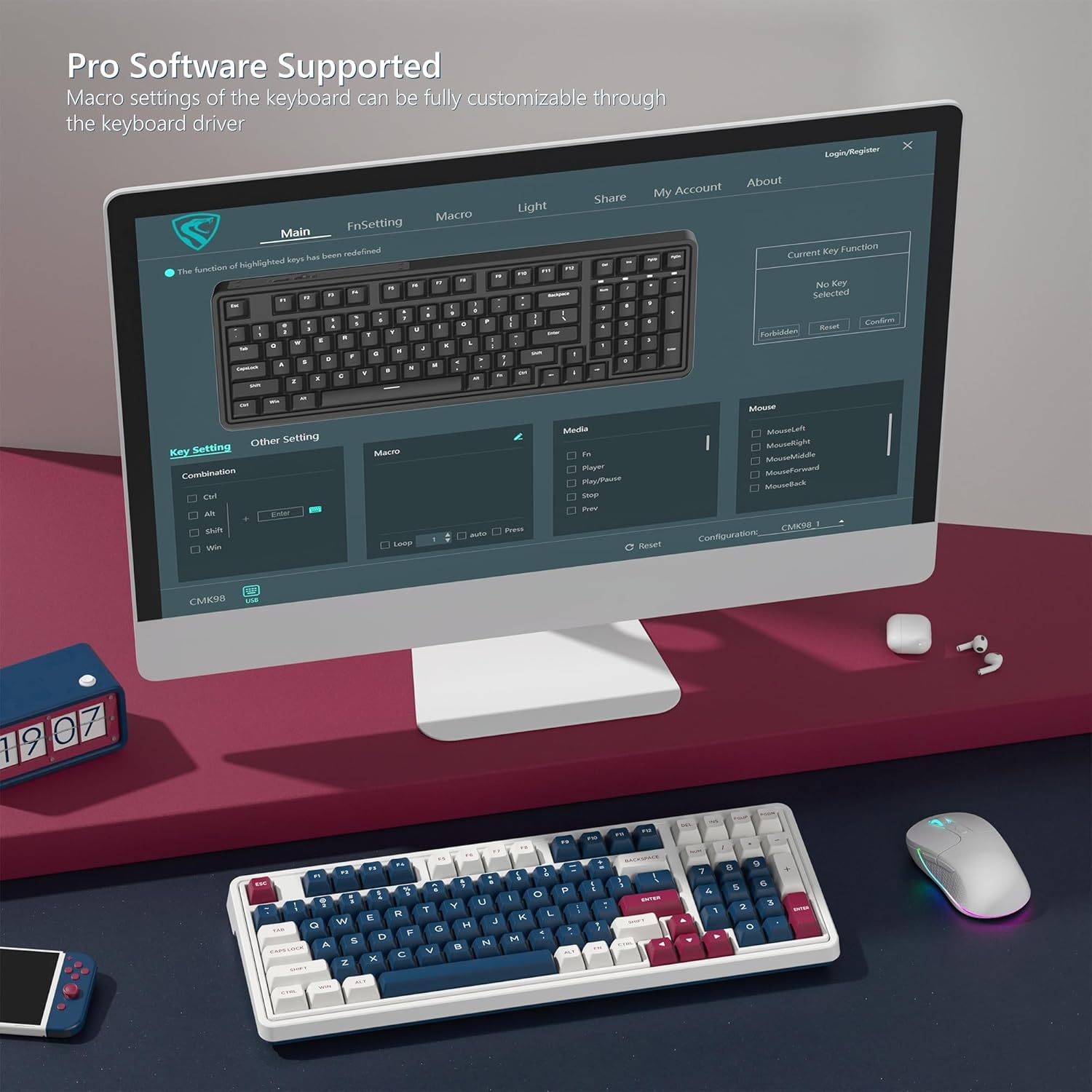 - 【Programming Macros & PBT Keycaps】CMK98 is a premium mechanical keyboard for both work and game. All keys support macro customization, which allows macro recording and editing, customize key function and supports cool music rhythm lighting effects with driver. N-key rollover, keyboard can respond to multiple key presses at the same time, which is helpful in very exciting real-time games. Double shot PBT keycaps, made from two colors material molded into each others, make the keycaps characters maintain the vibrance and saturation, clear and not fade.