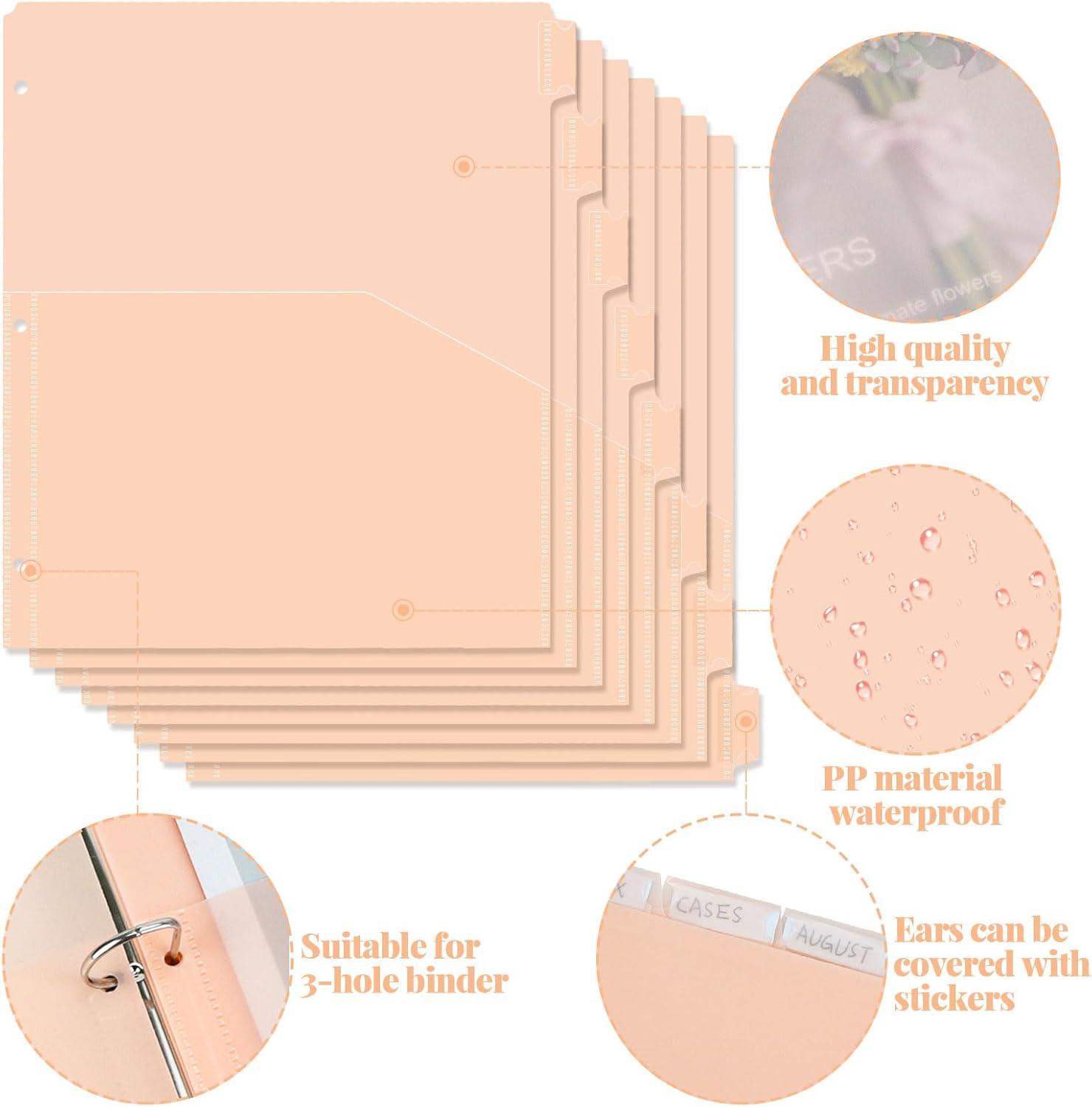 8 tab dividers for 3 Ring Binder with Pockets, Plastic Dividers with Clear Front Pocket, 8-tab Index Dividers with 3 Holes Punched for School & Office Supplies (Light Orange, 8 Tabs)