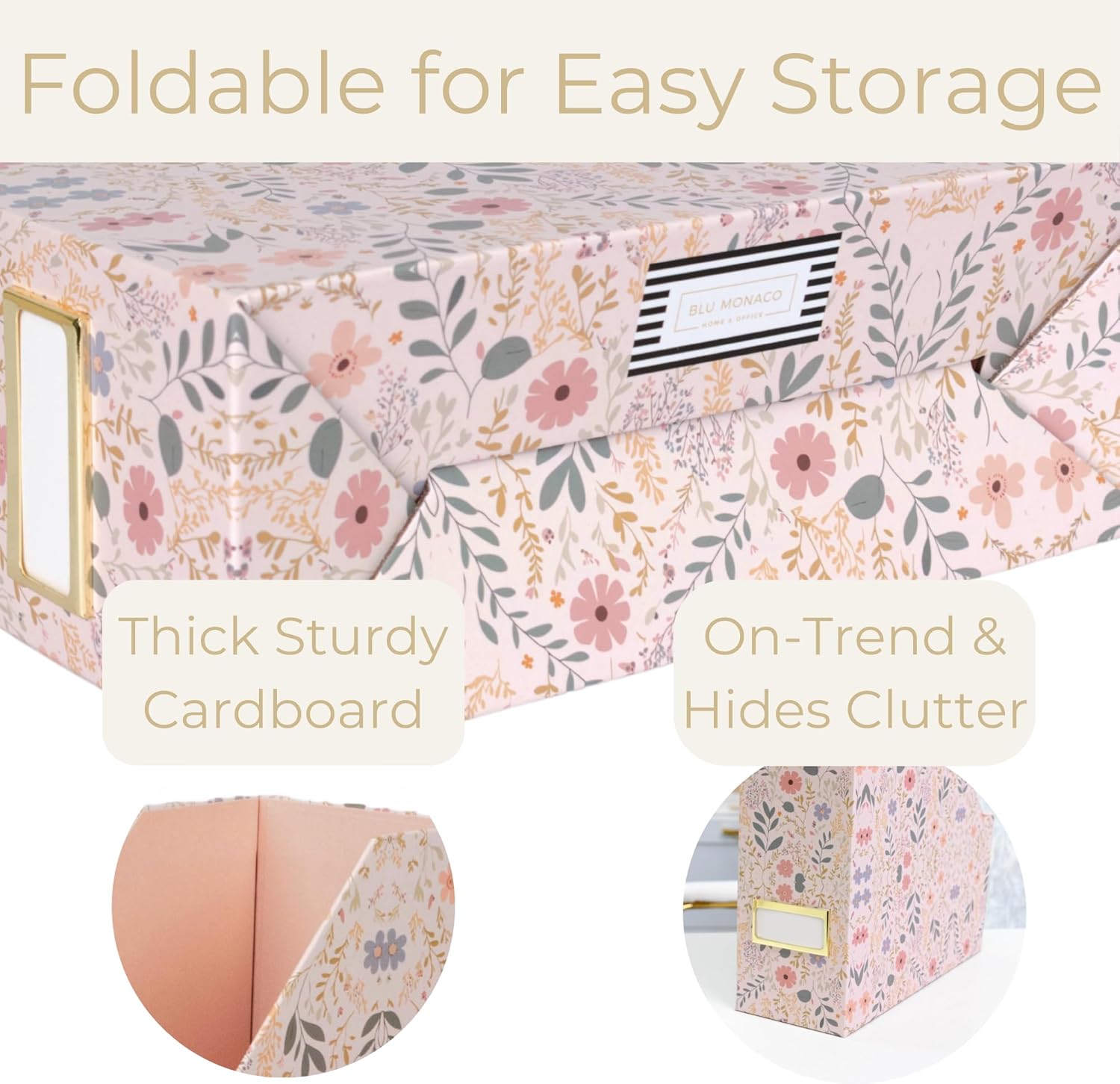 BLU MONACO Foldable Magazine File Set of 4 with Floral Boho Design – Decorative Cardboard Magazine Organizer for Home, Office & Dorm Room – Artistic Magazine Storage Solution