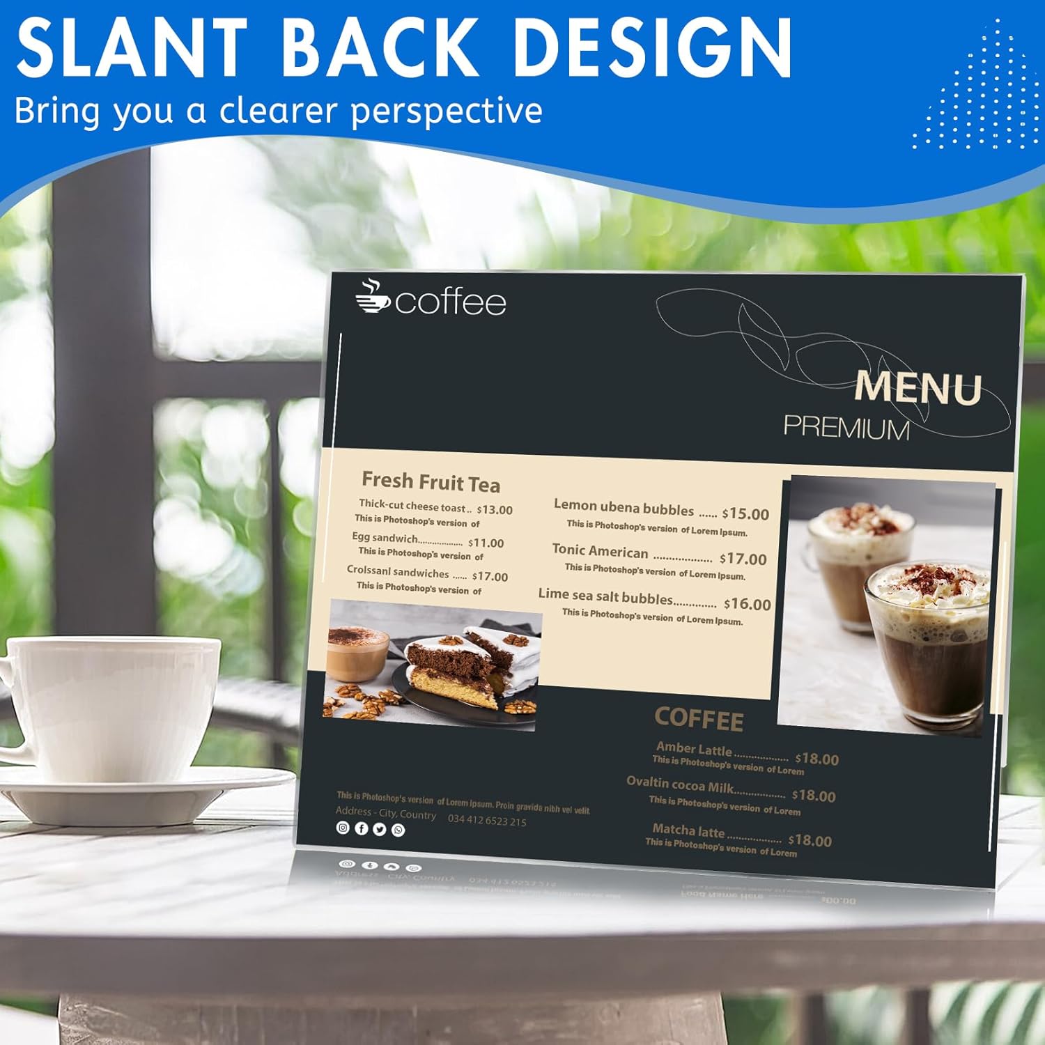 - Slant Back Design: The acrylic sign holders are designed with a slant back and tilts at a perfect angle to display the information on the paper, whether it's a guideline message or a dish. The bottom of the acrylic sign holder 8.5 x 11 is supported by an anti-tilt base for stability. Note: In order to ensure that you receive the most perfect table sign holders, we have attached a protective film on the surface of each acrylic stand, please remove the film before use