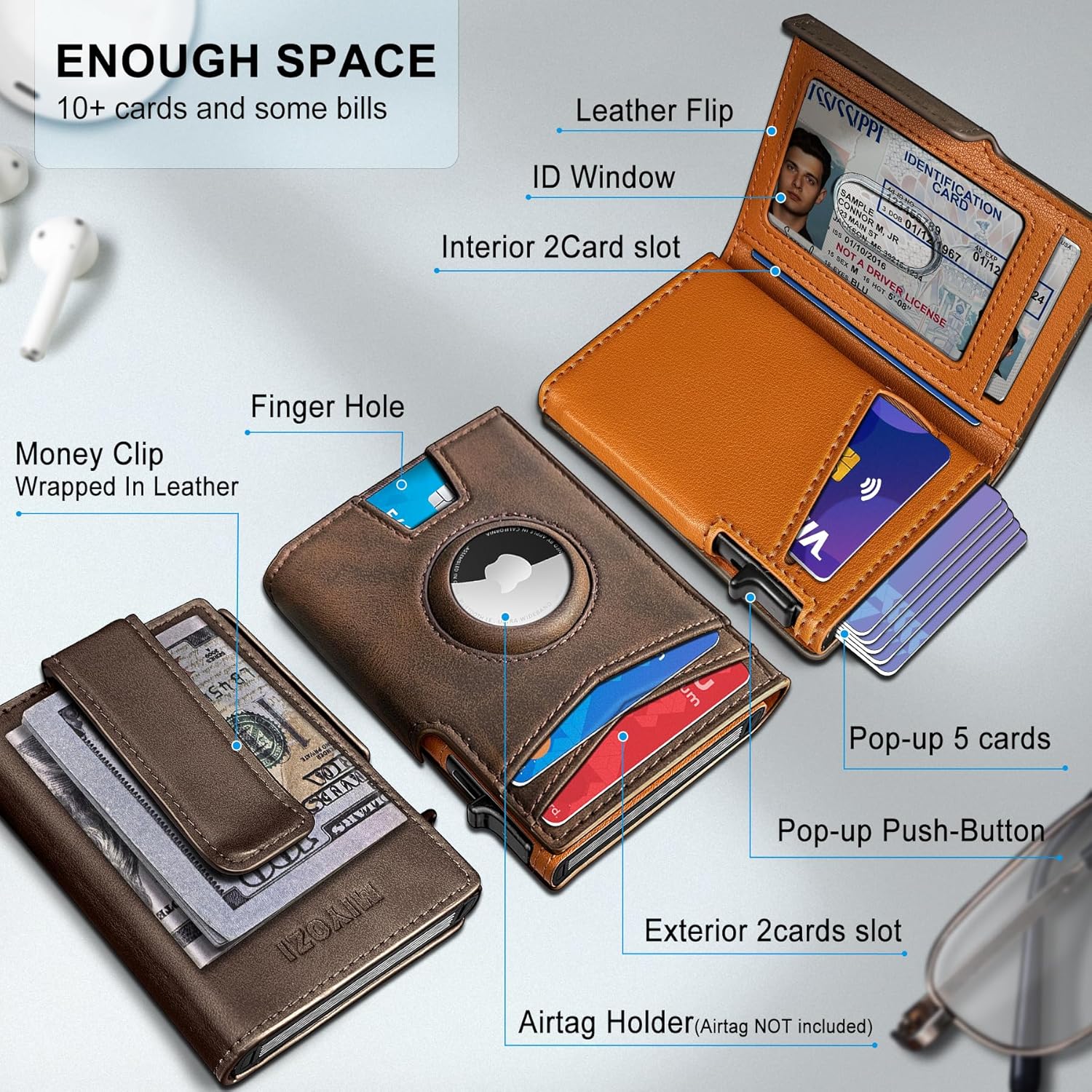 • ENOUGH SPACE-- 10 Cards can be inseted in this slim smart wallet, With 2 daily cards slots outside and 3 cards slots inside (1 ID windows included), The metal case can holds 5 cards, And money clip with Leather wrapped for carrying cash, More friendly for cash;
